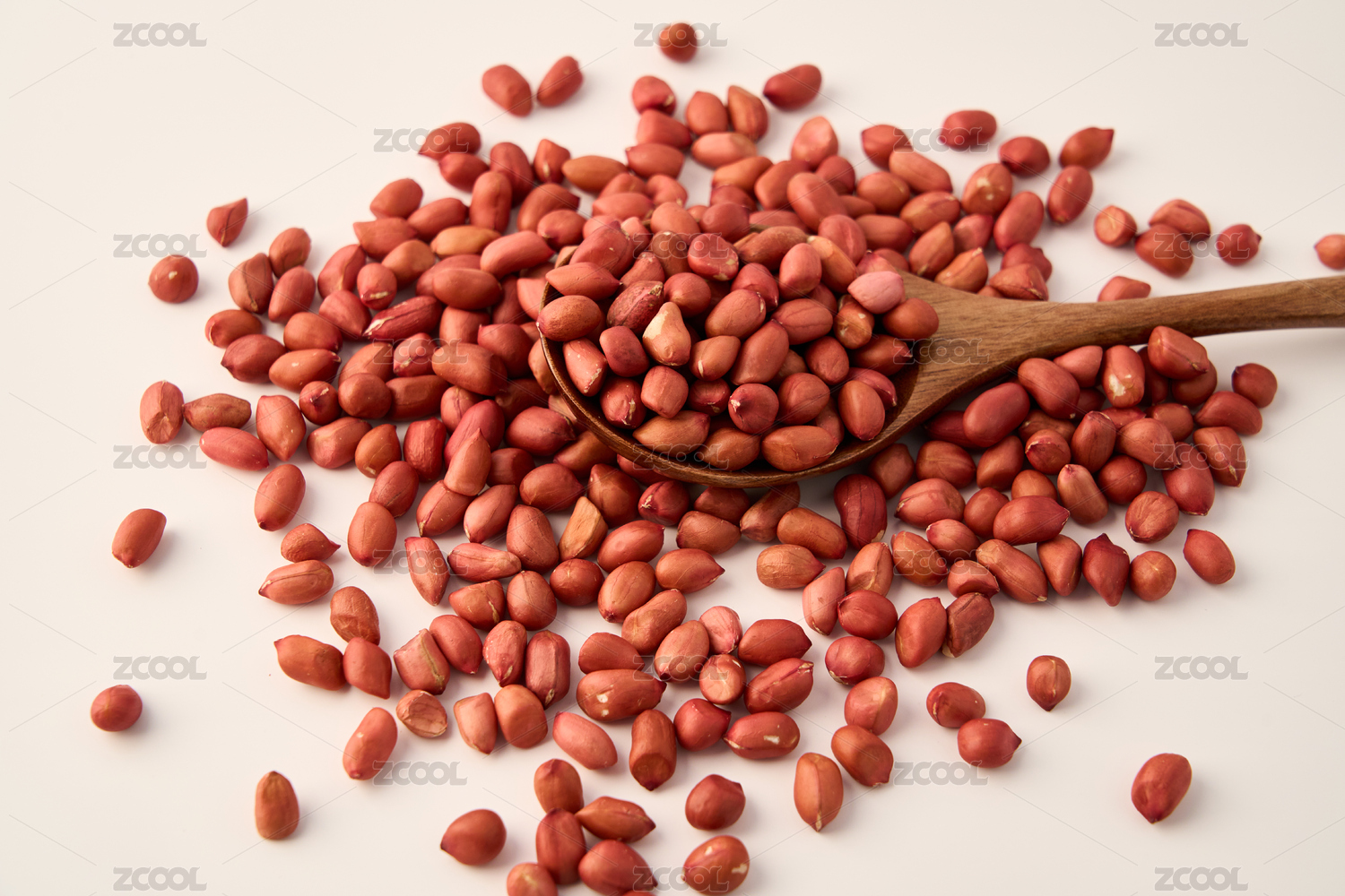 白底上的花生米和勺子里的红衣红生米