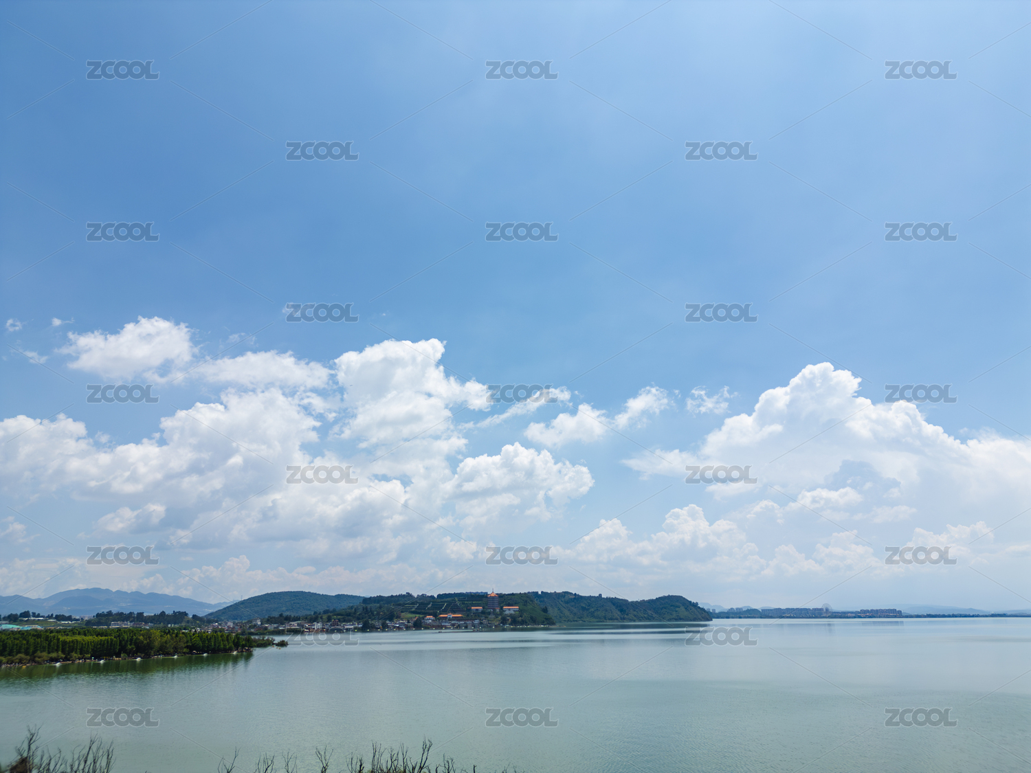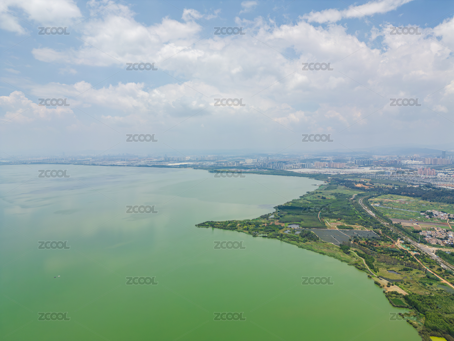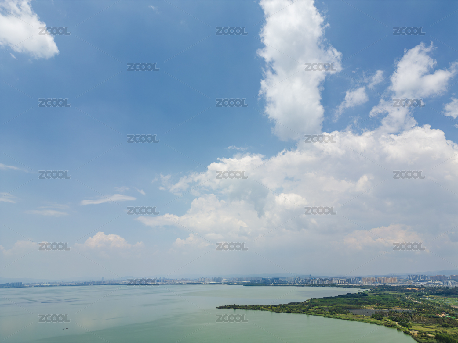 城市景观,航拍,自然风光,山脉,湖泊,建筑群,住宅区,绿地,蓝天,白云