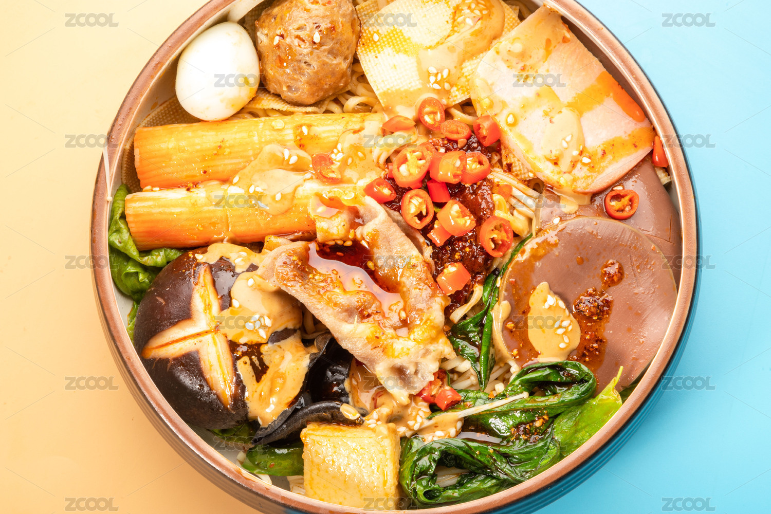 蓝色卡纸上放着一盘麻辣烫