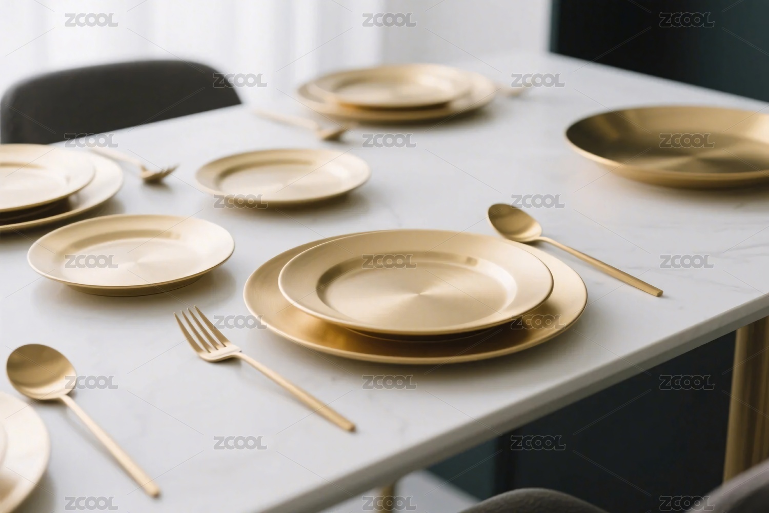 大理石餐桌上摆放整齐的餐盘及刀叉等餐具