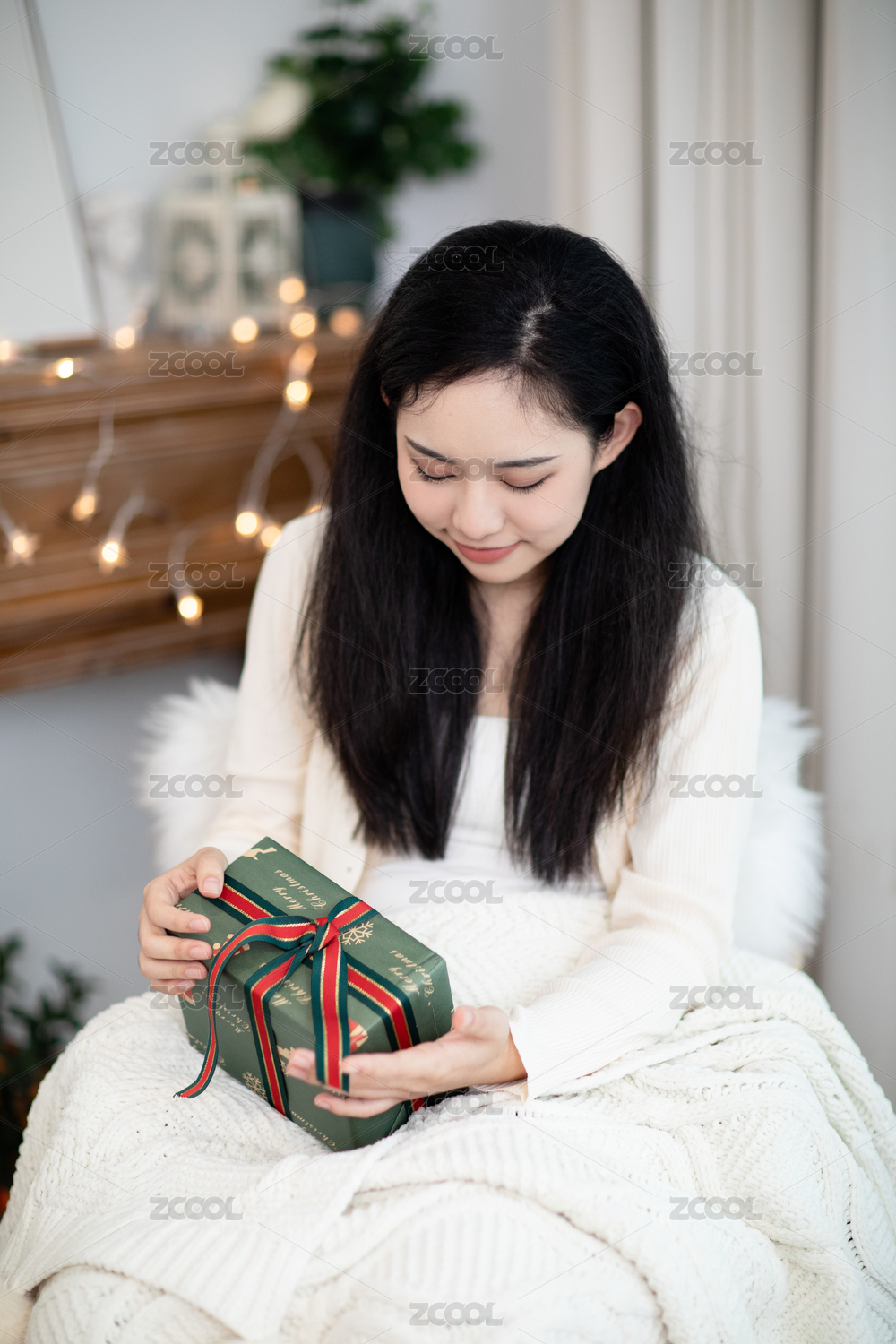 圣诞节收到礼物的美丽女孩打开礼盒惊喜又开心