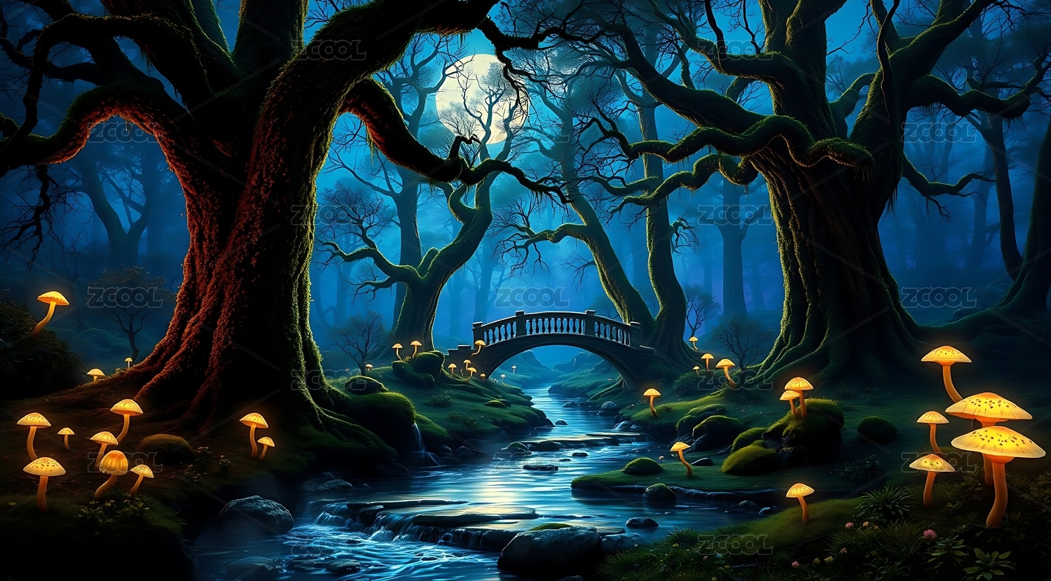 夜幕下的神秘森林树影婆娑发光蘑菇点缀其中