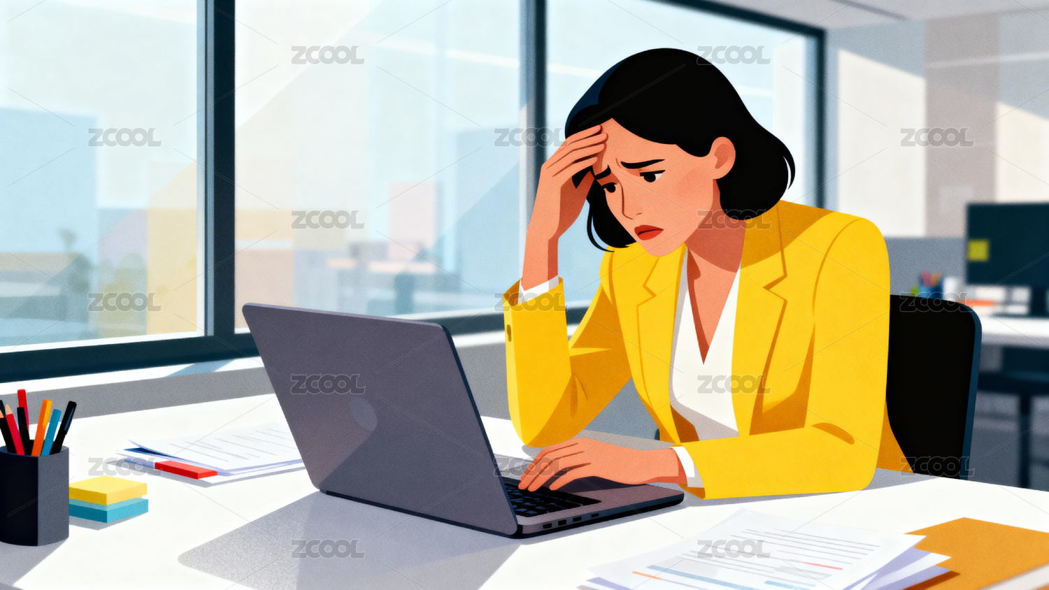 一个男人坐在办公电脑前双手挠头,表情痛苦