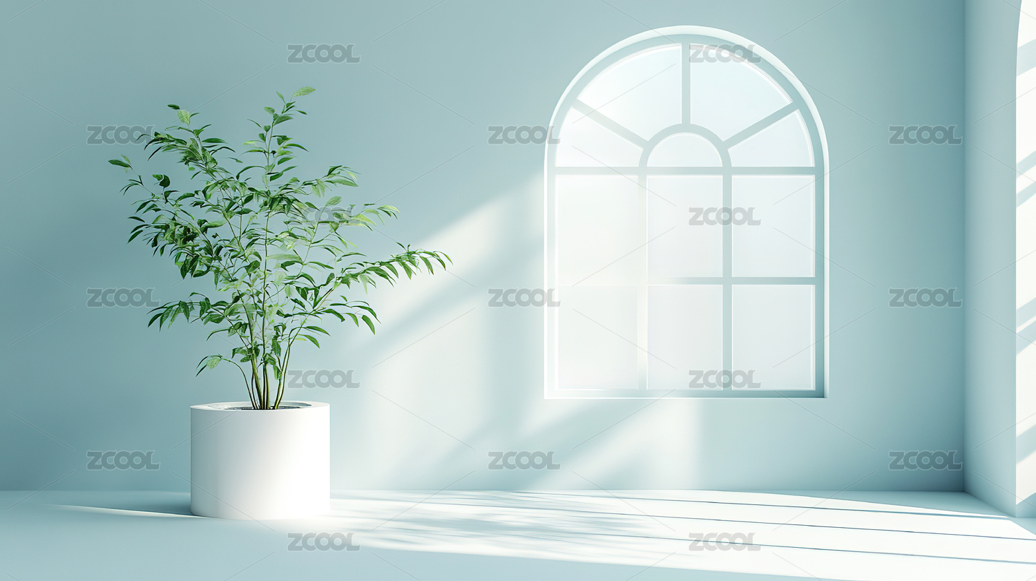 简约,室内场景,白色,圆形讲台,光滑,白色地面,讲台,半透明,拱形窗户,窗户