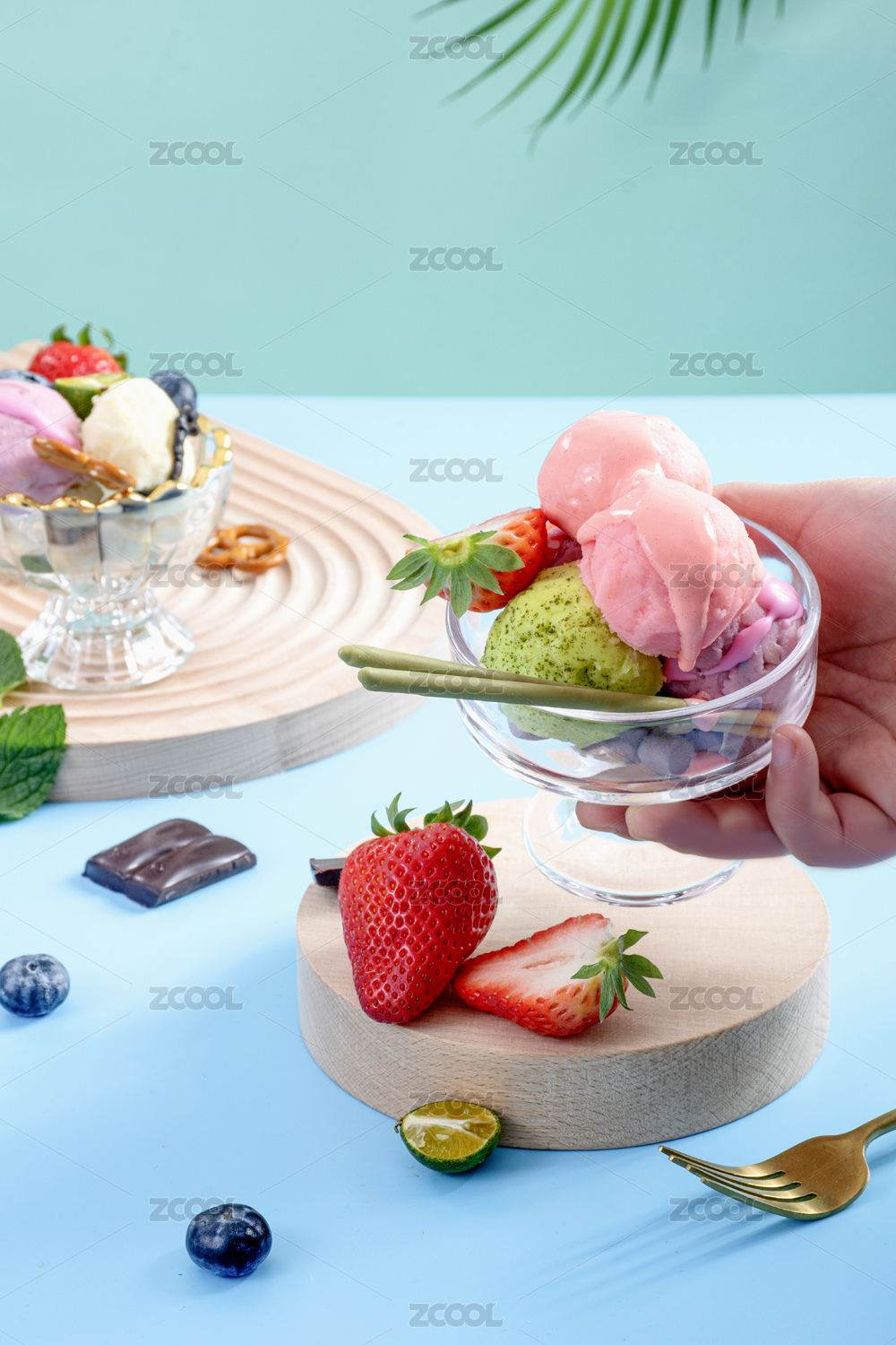 冰淇淋球,水果,盘子,蓝色,凉的,多种,彩色,很多个,食品,美食