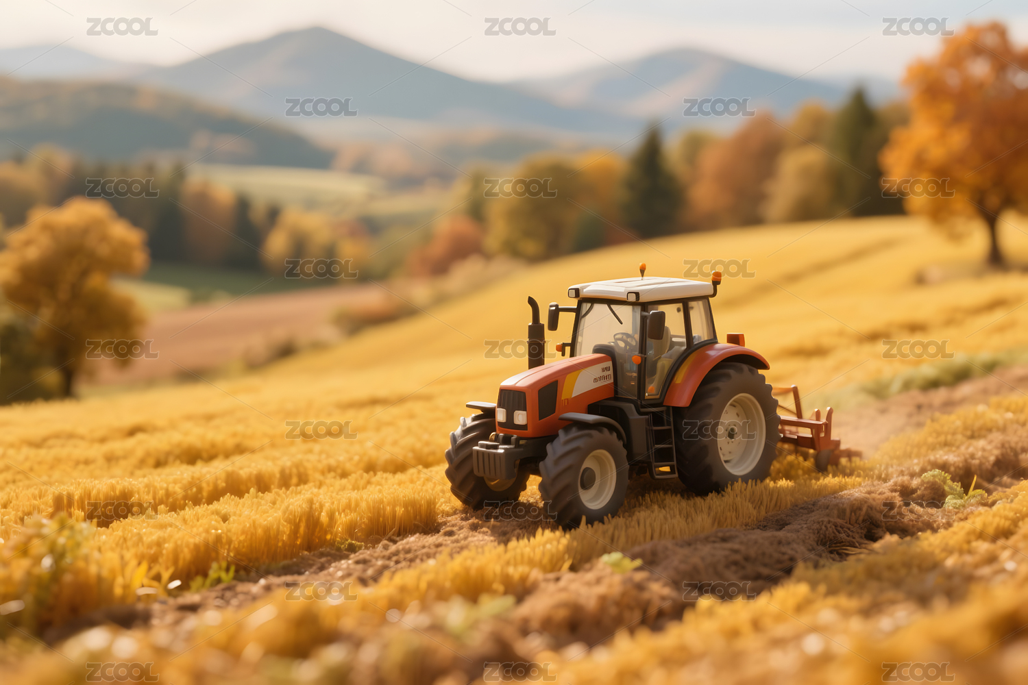 收割机收获成熟稻田丰收秋天乡村场景插图