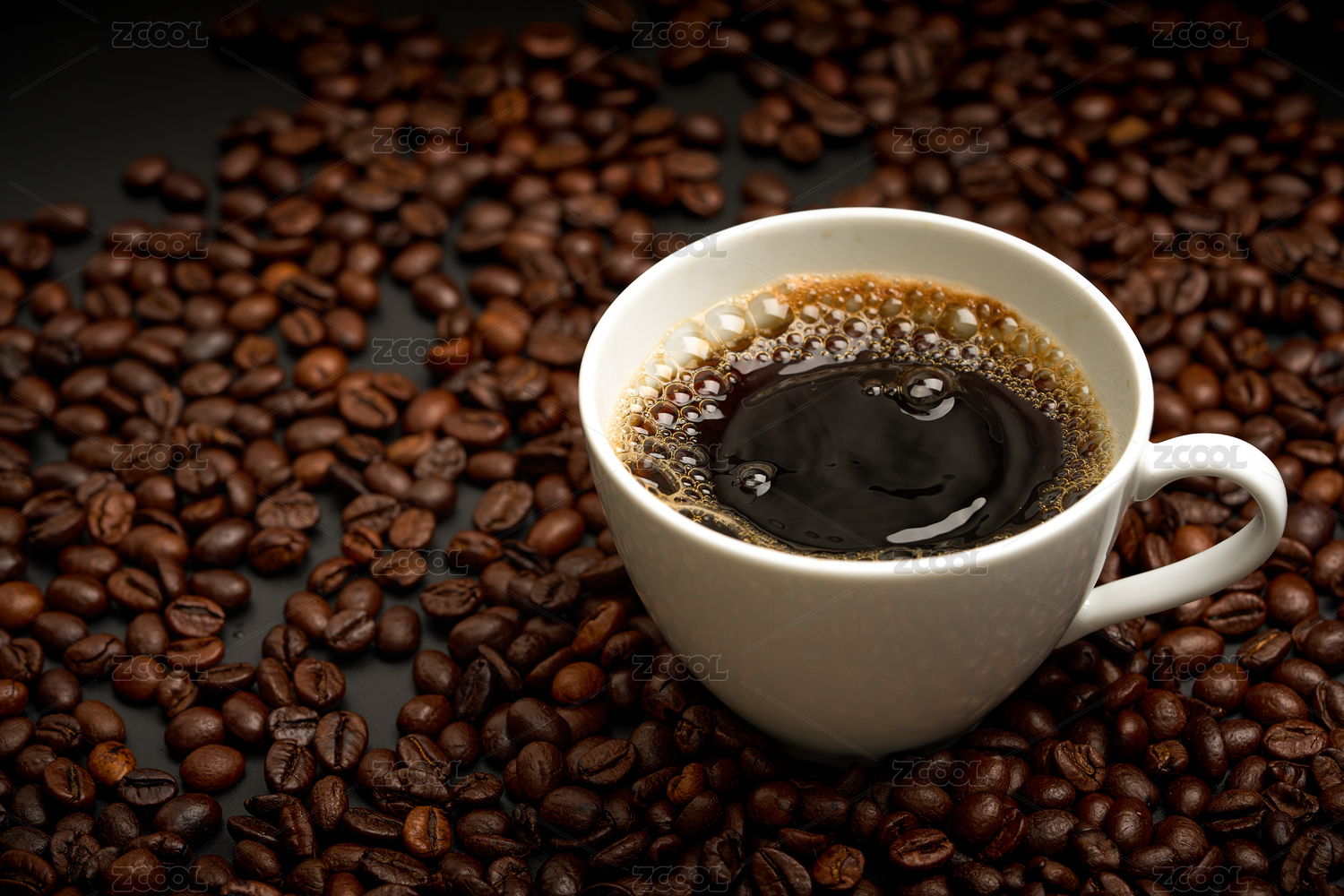 咖啡豆中间有白色杯子含有咖啡的特写画面