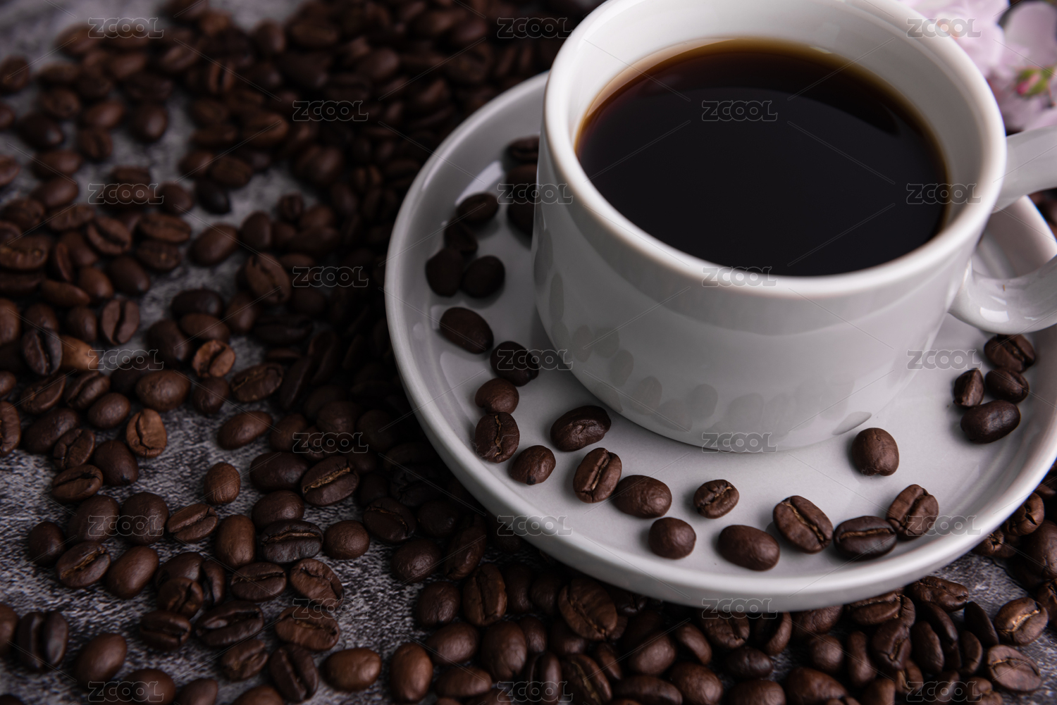 一堆阿拉比卡咖啡豆中白色的杯子盛有咖啡