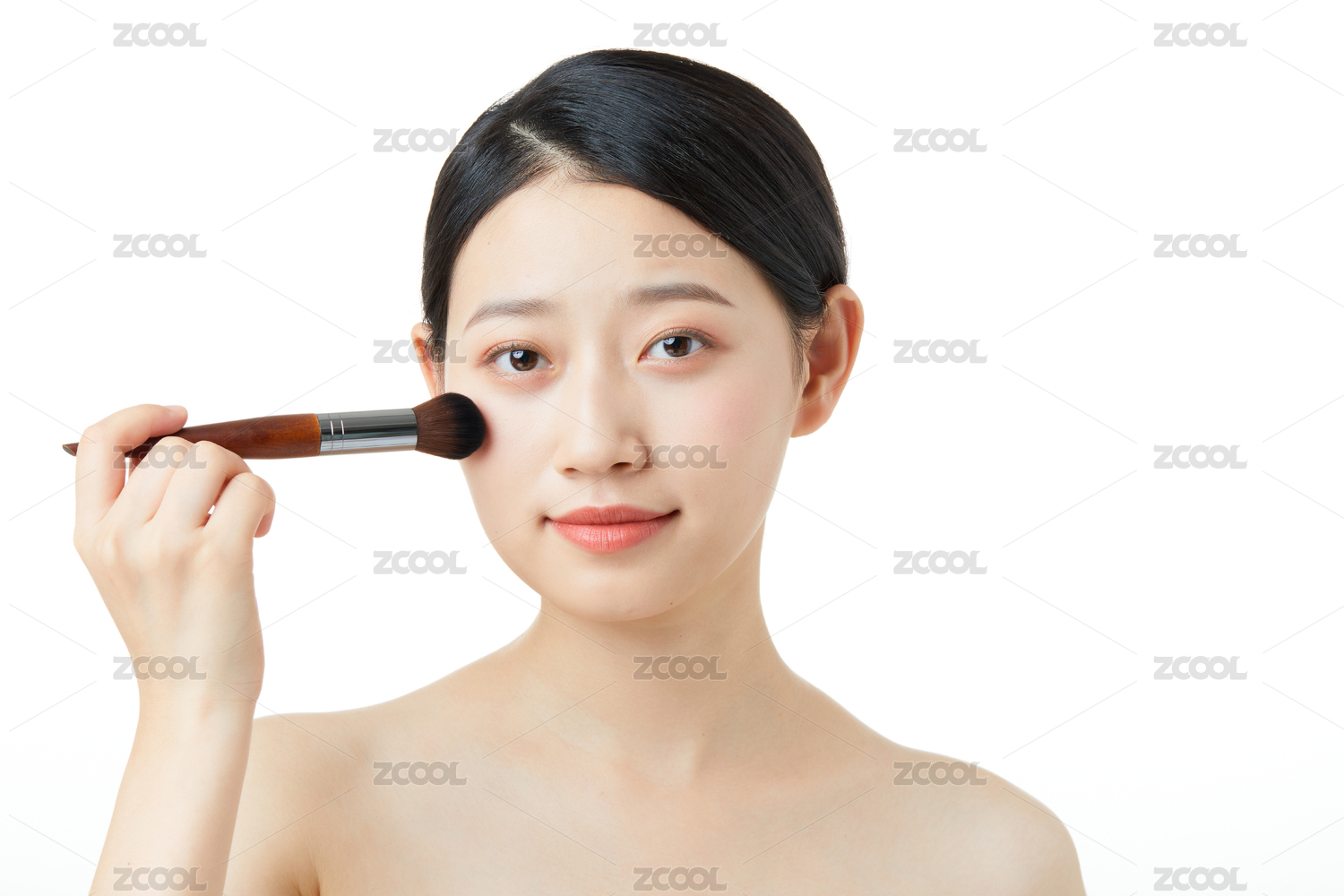 灰色背景里手中拿着化妆刷的亚洲美女面部特写,化妆护肤整容