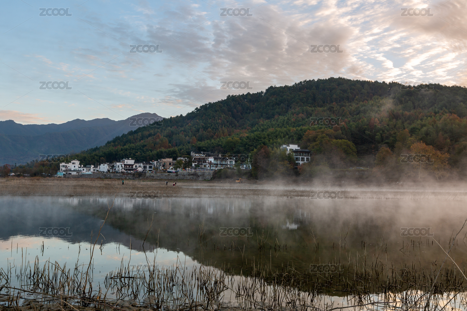 安徽省黄山市黟县宏村奇墅湖日出晨雾风光