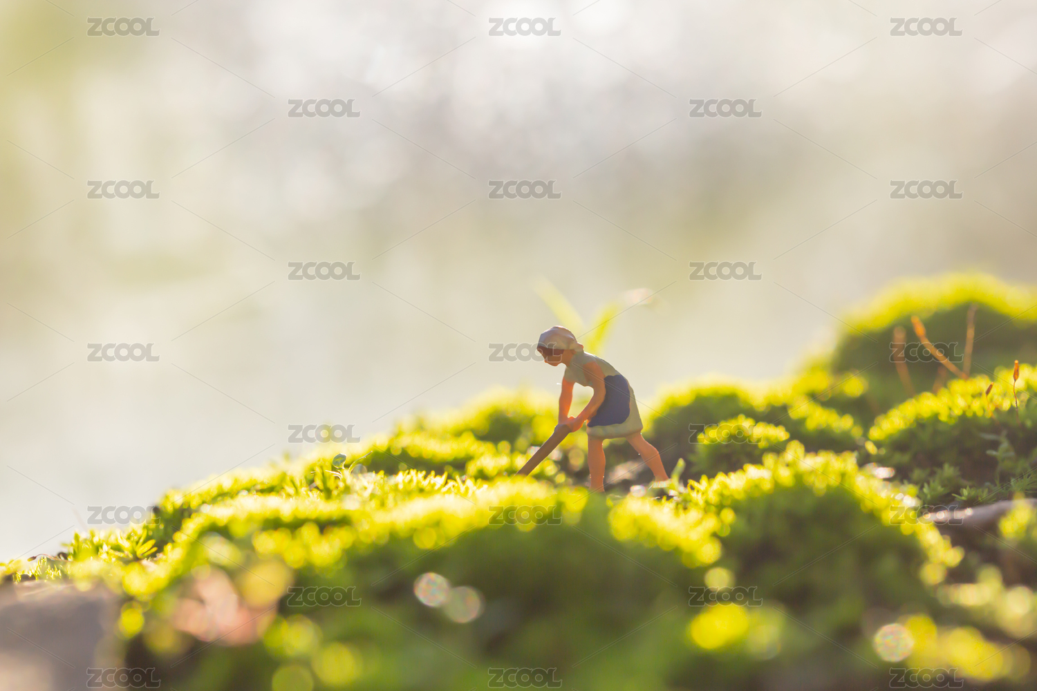 在绿色的苔藓上工作的小人