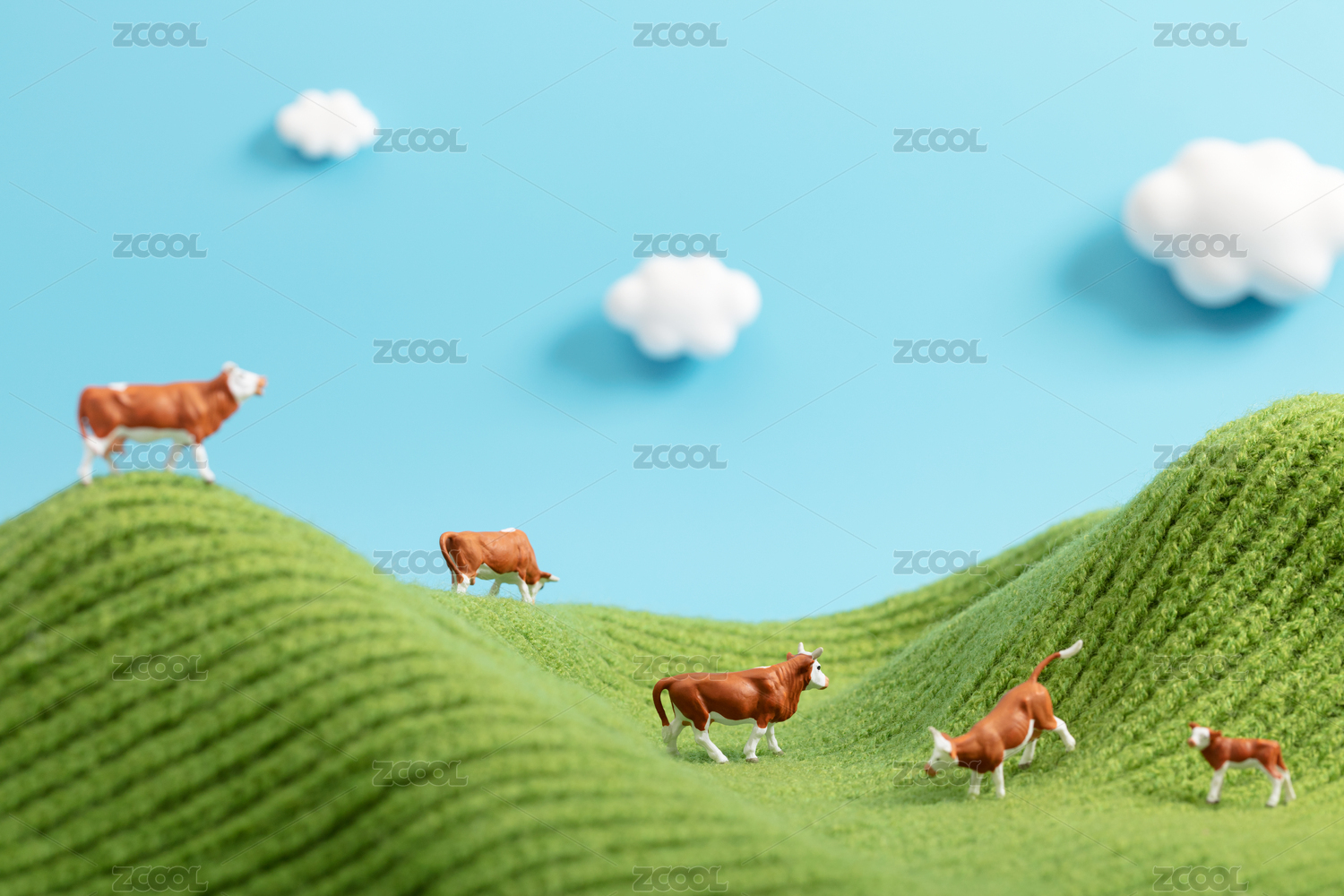 微缩场景蓝天白云下的牛场