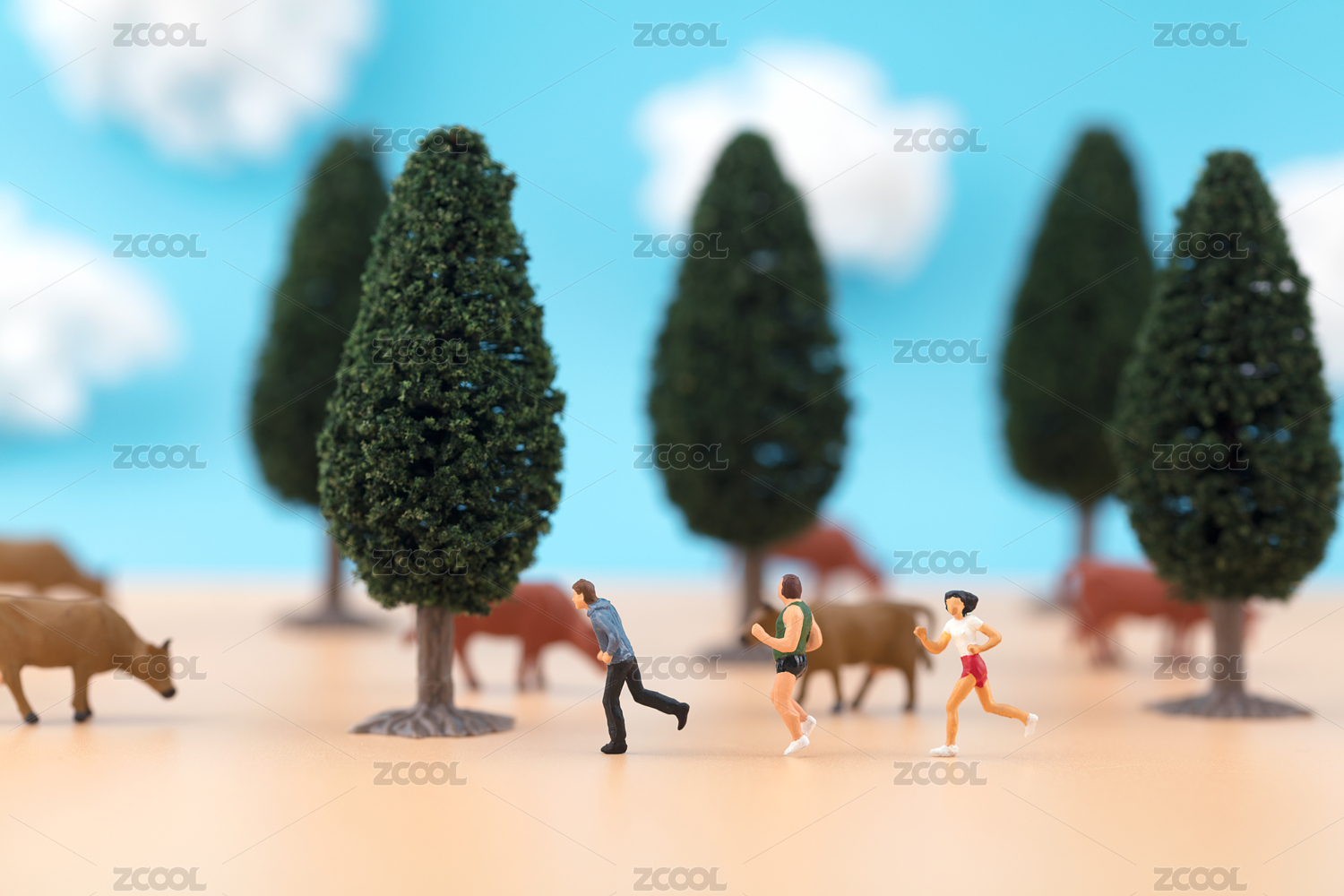 微缩创意户外跑步树木和牛