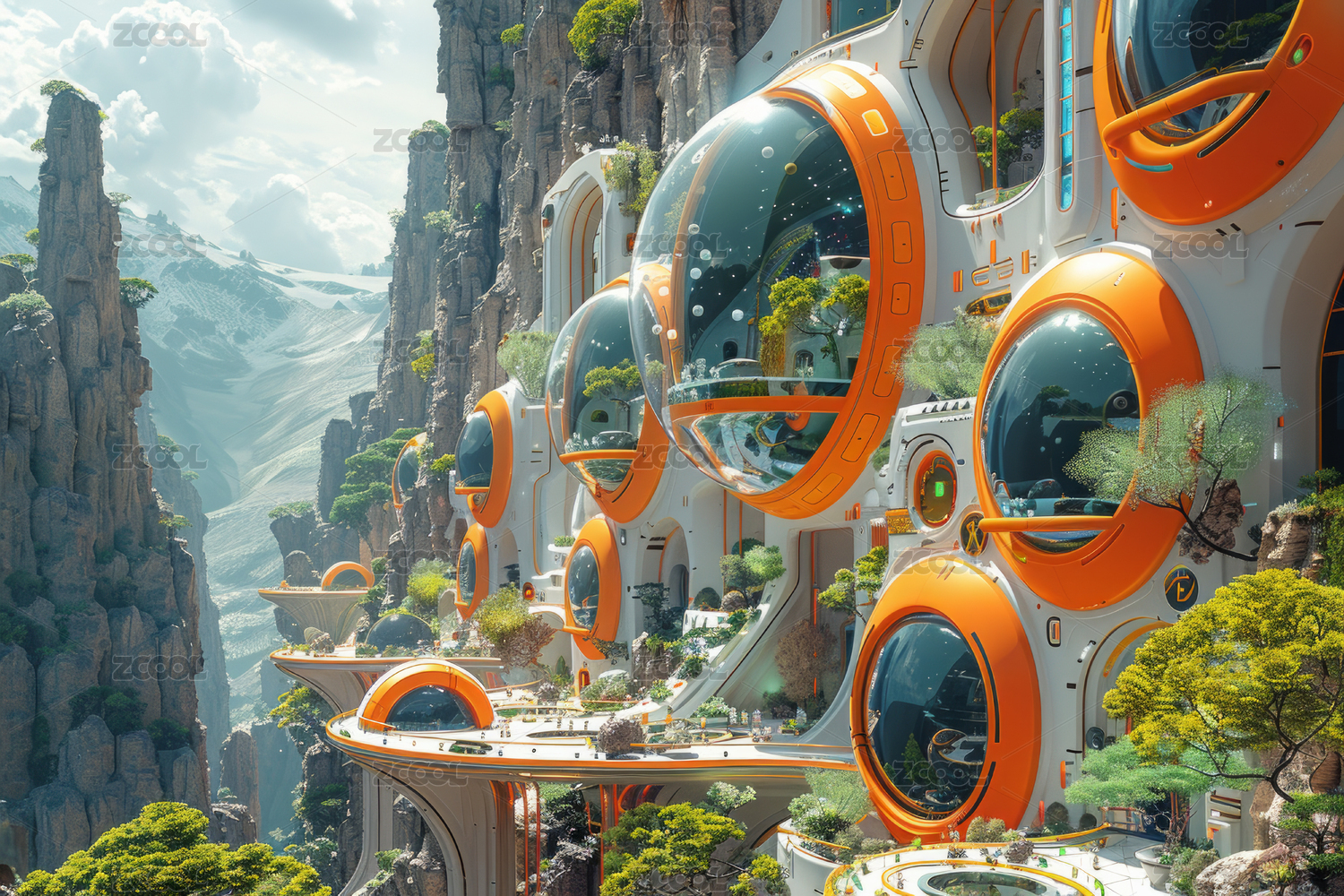 有磁悬浮交通舱和磁轨的未来城市概念图