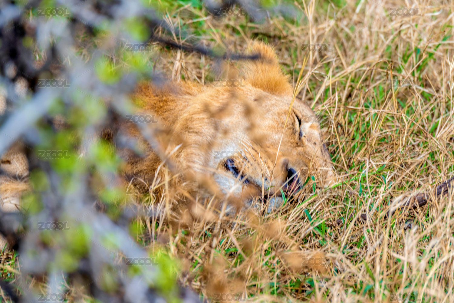 肯尼亚的国家公园中隐藏在高高的草丛间的非洲狮子