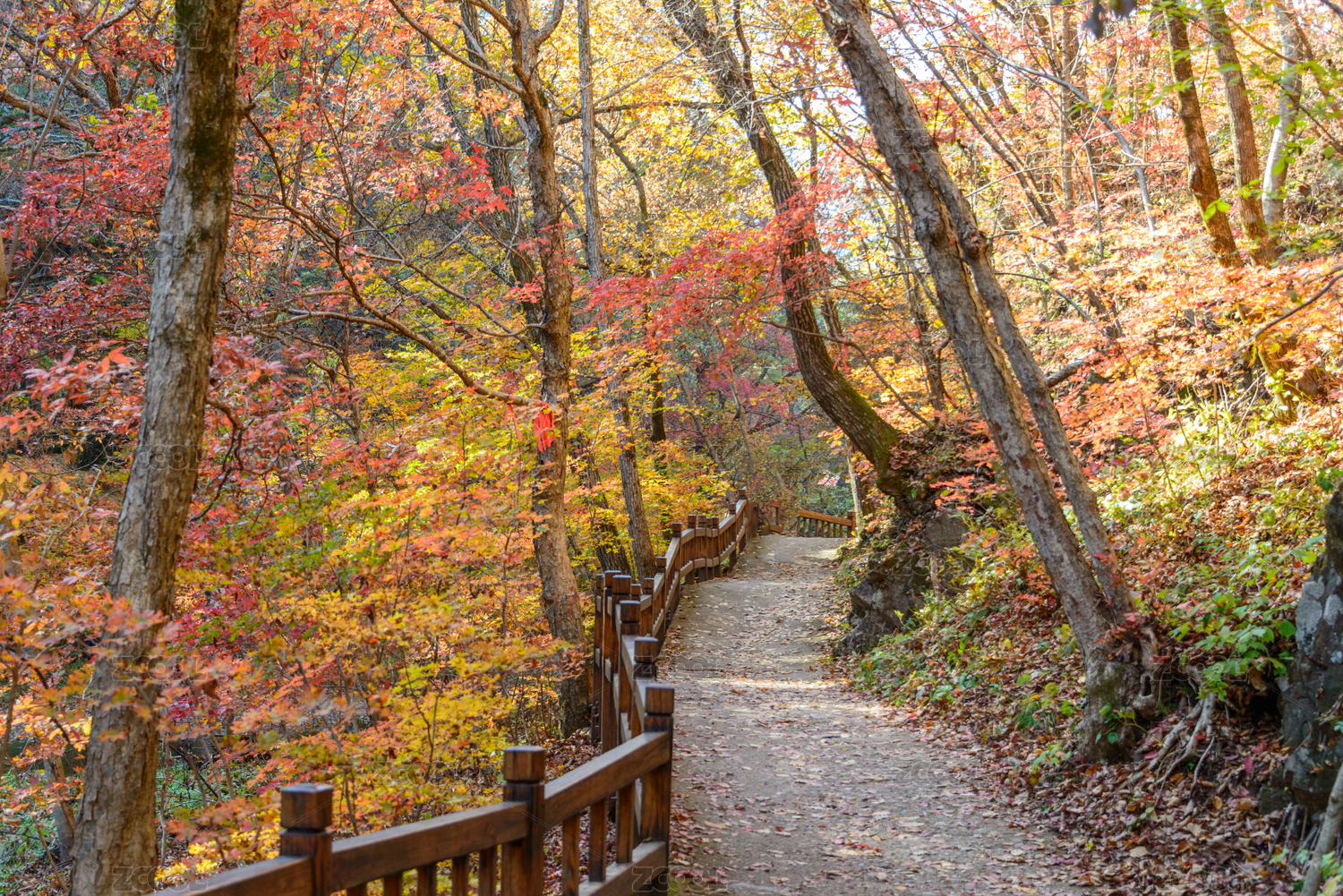 沈阳本溪老边沟,秋季多彩枫叶林间小路风光