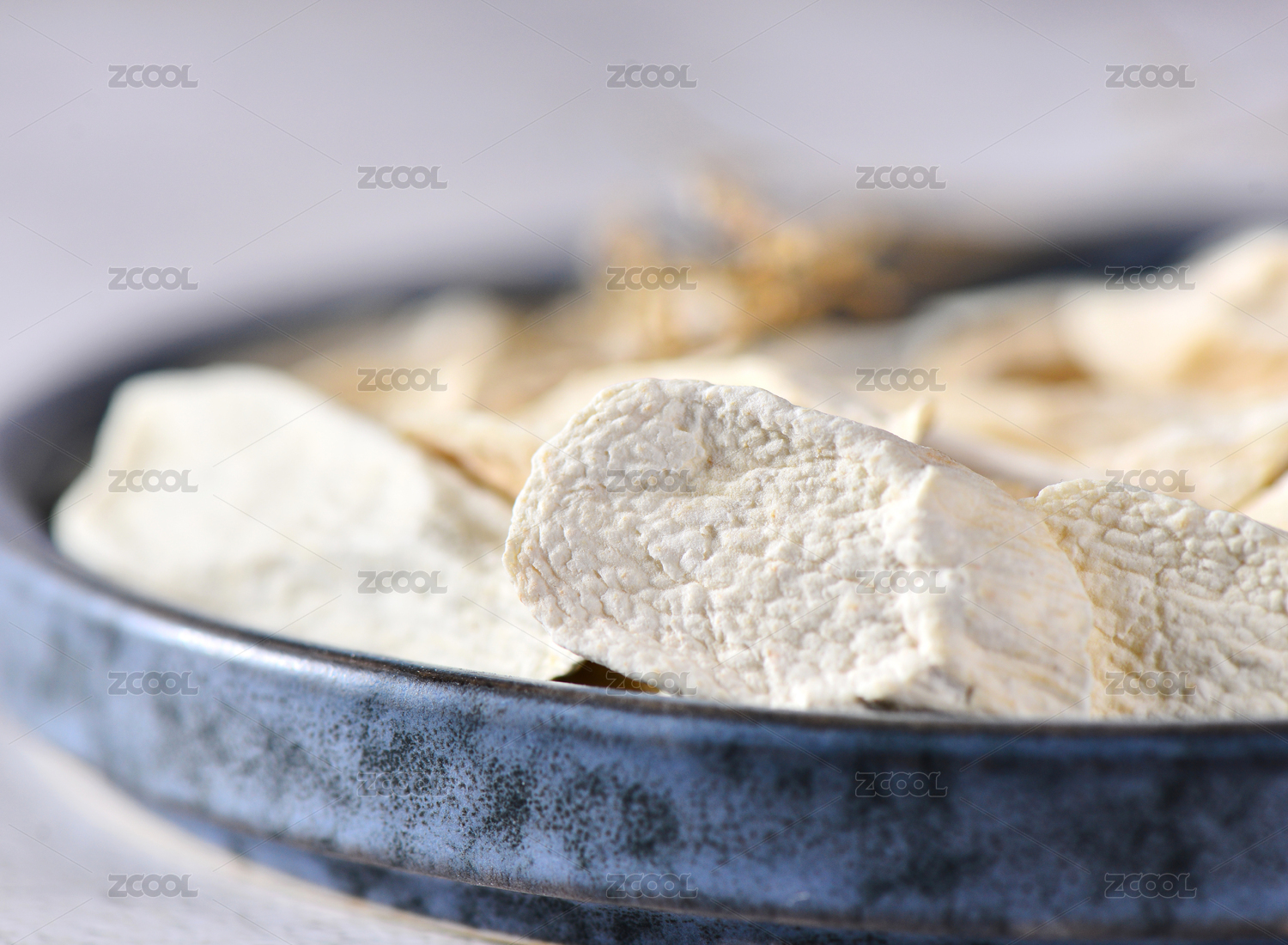 浅色背景上餐具里摆放的切片山药干