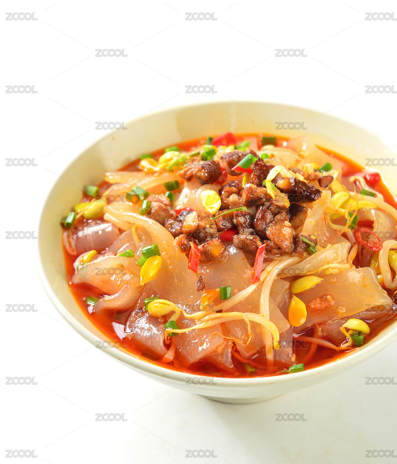 白圆盘里的辣味卤制猪蹄凉菜卤菜