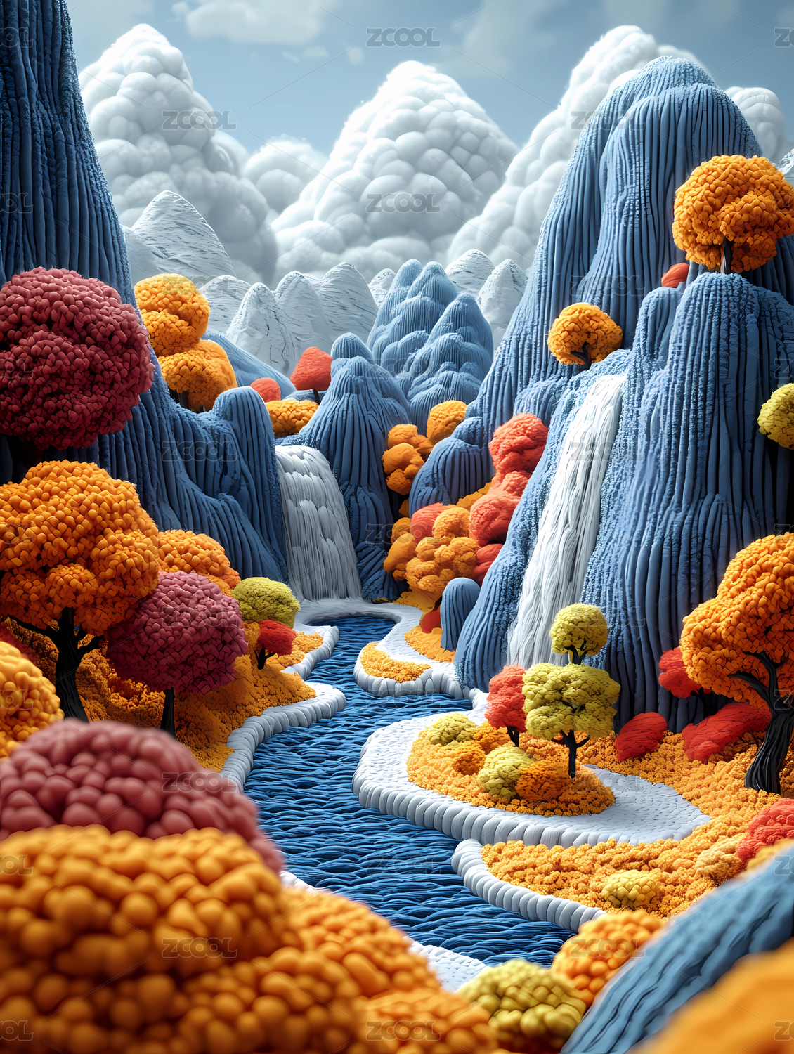 冬日温暖粗毛线质感创意瀑布卡通山水画