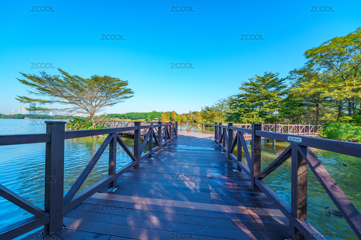 晴朗,绿树,木板路,风景,天空,碧绿,阳光,树林,绿色,植物