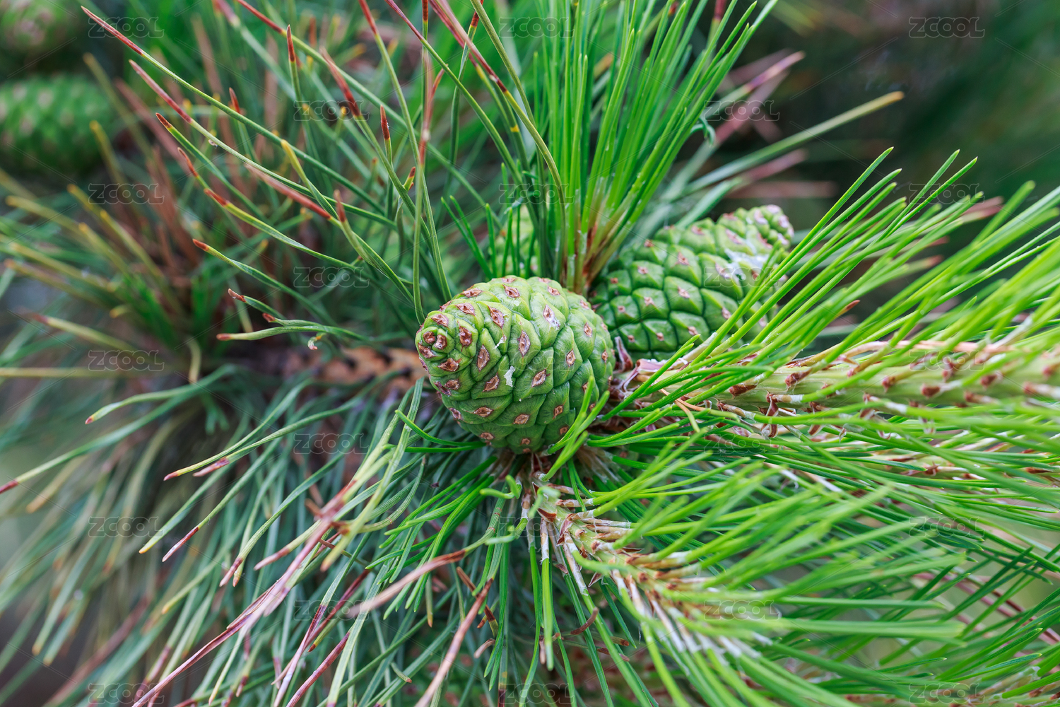 绿色植物松树果实及针状树叶特写