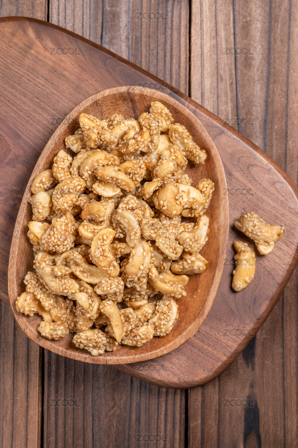 木托盘上的一盘芝麻腰果