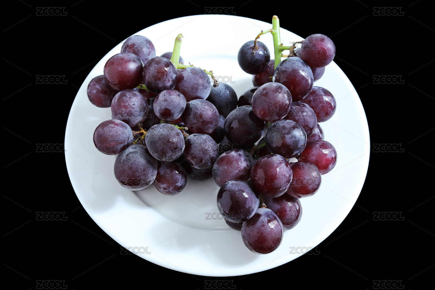 黑色背景上白色盘子里的一串葡萄