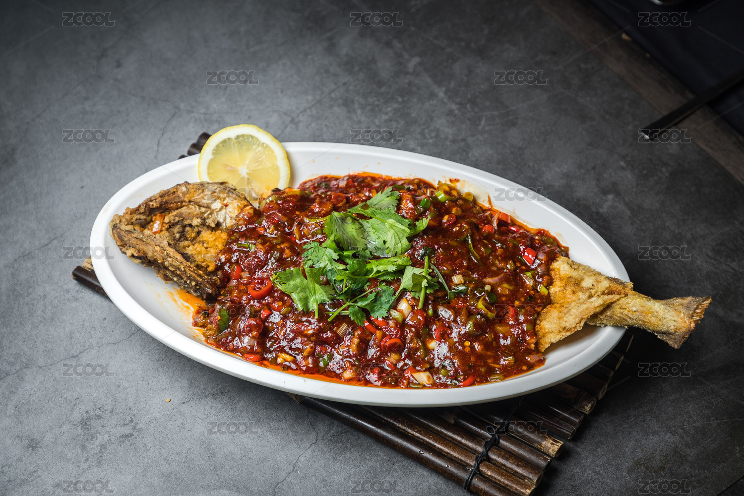 暗色水泥纹桌上放着一盘红烧鱼