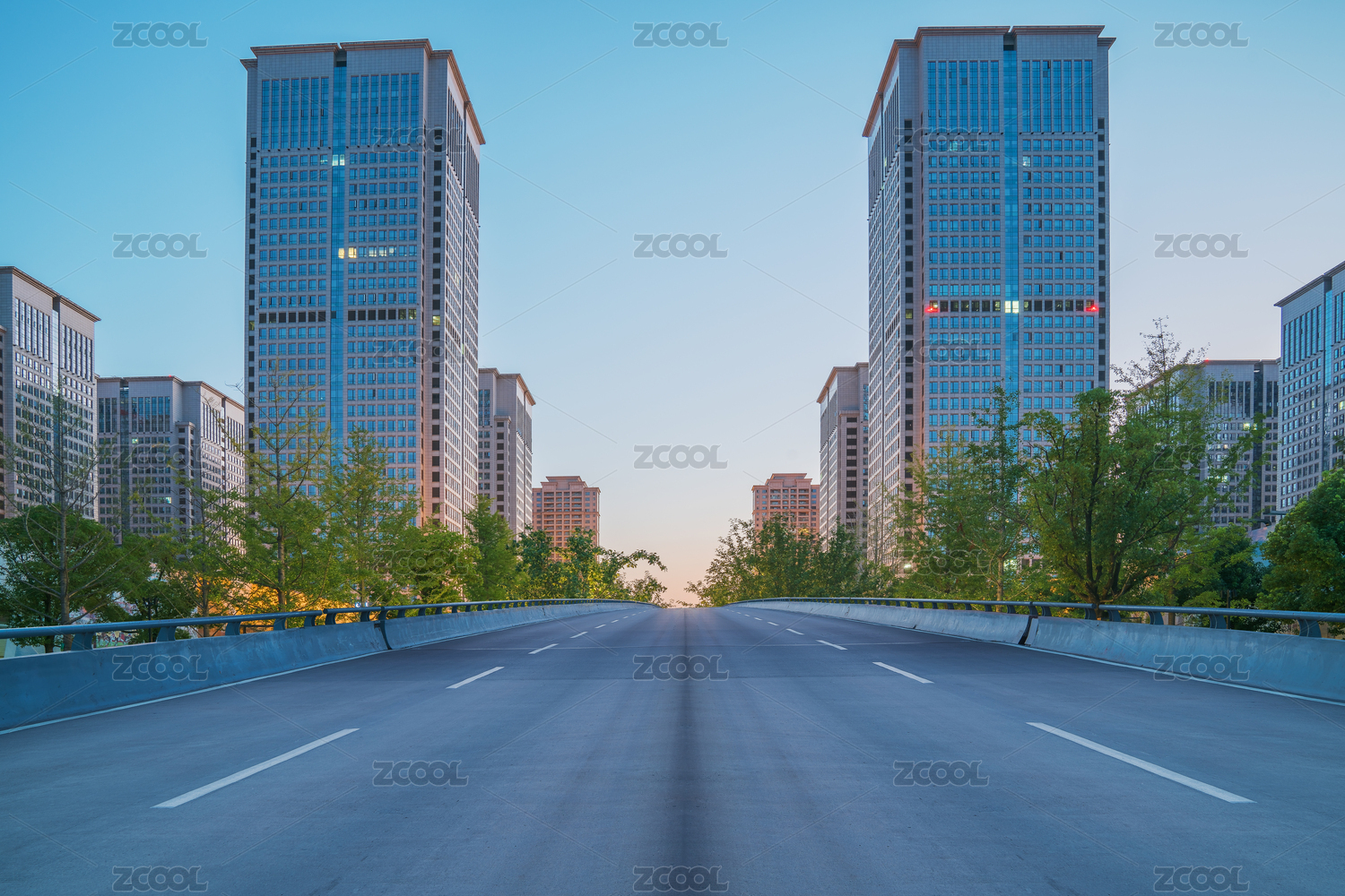 中国杭州空旷的柏油路与现代城市建筑天际线