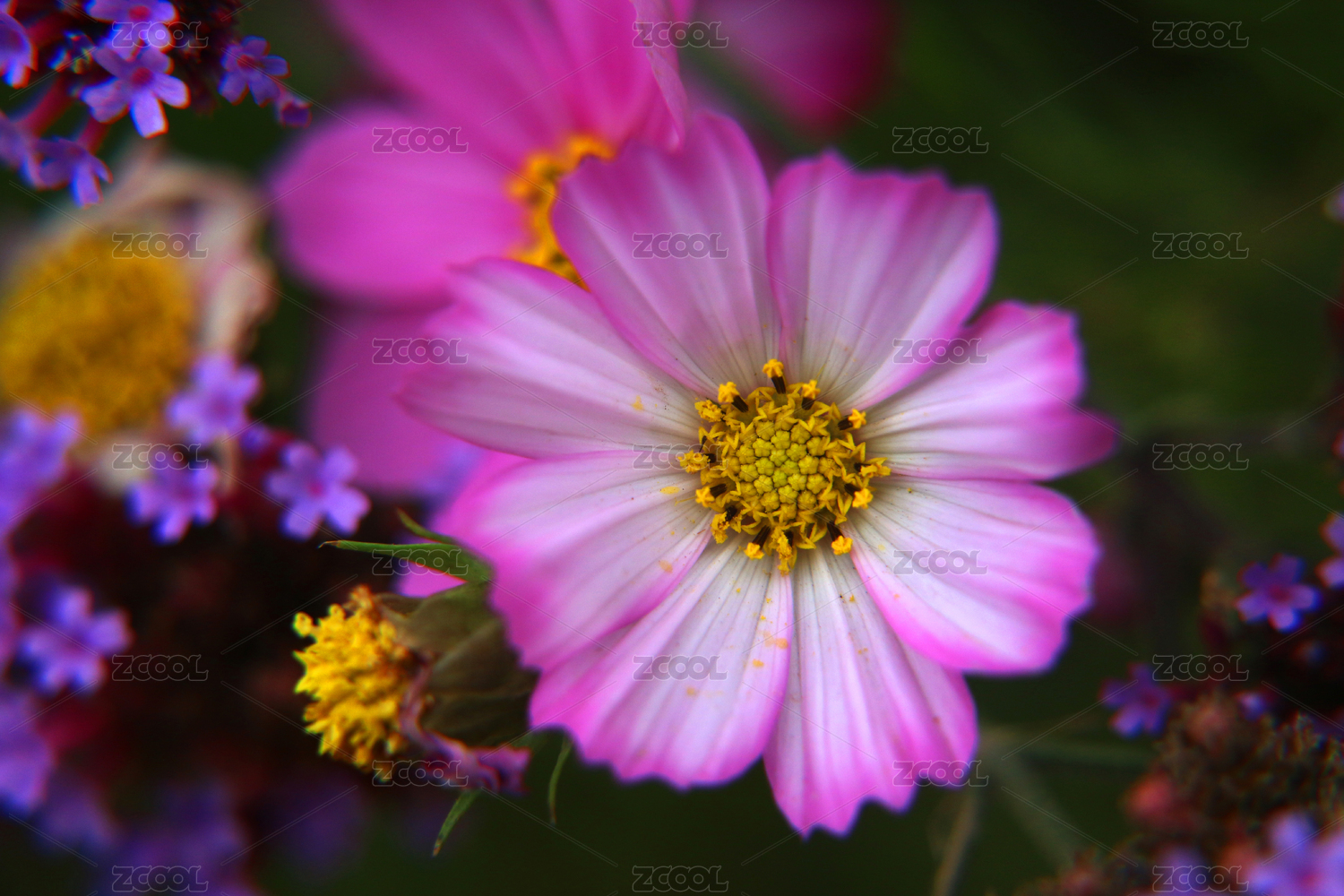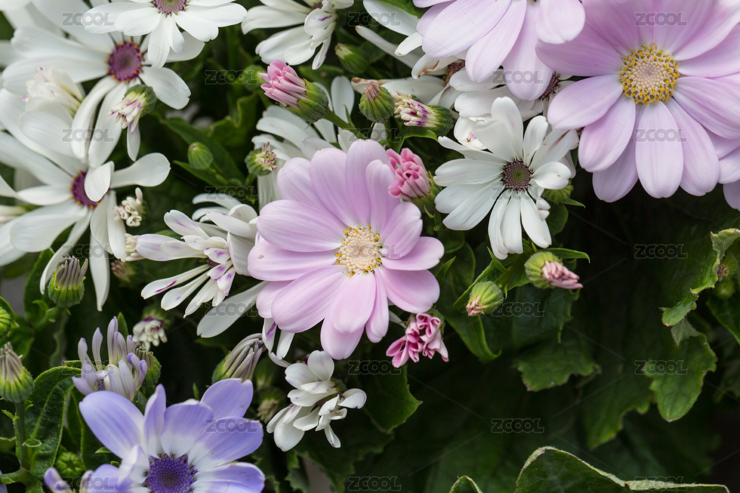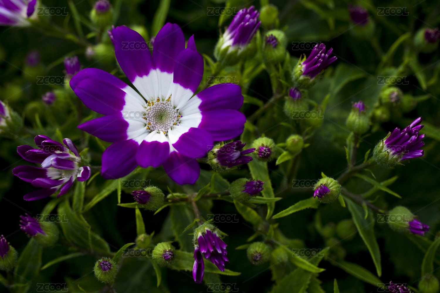 45度俯视暗绿色花丛背景中的白紫色花朵