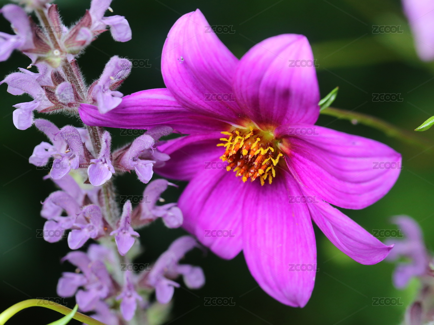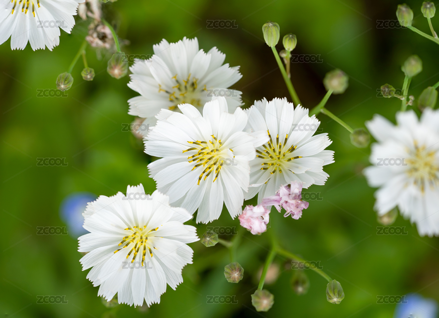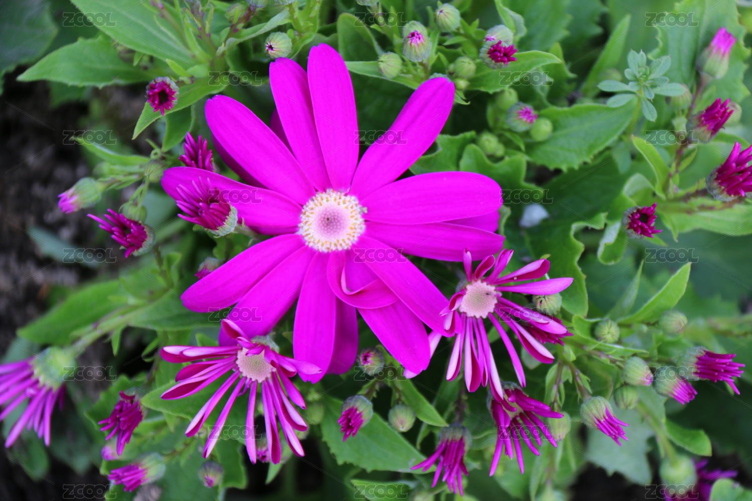 45度俯视暗绿色花丛背景中的白紫色花朵