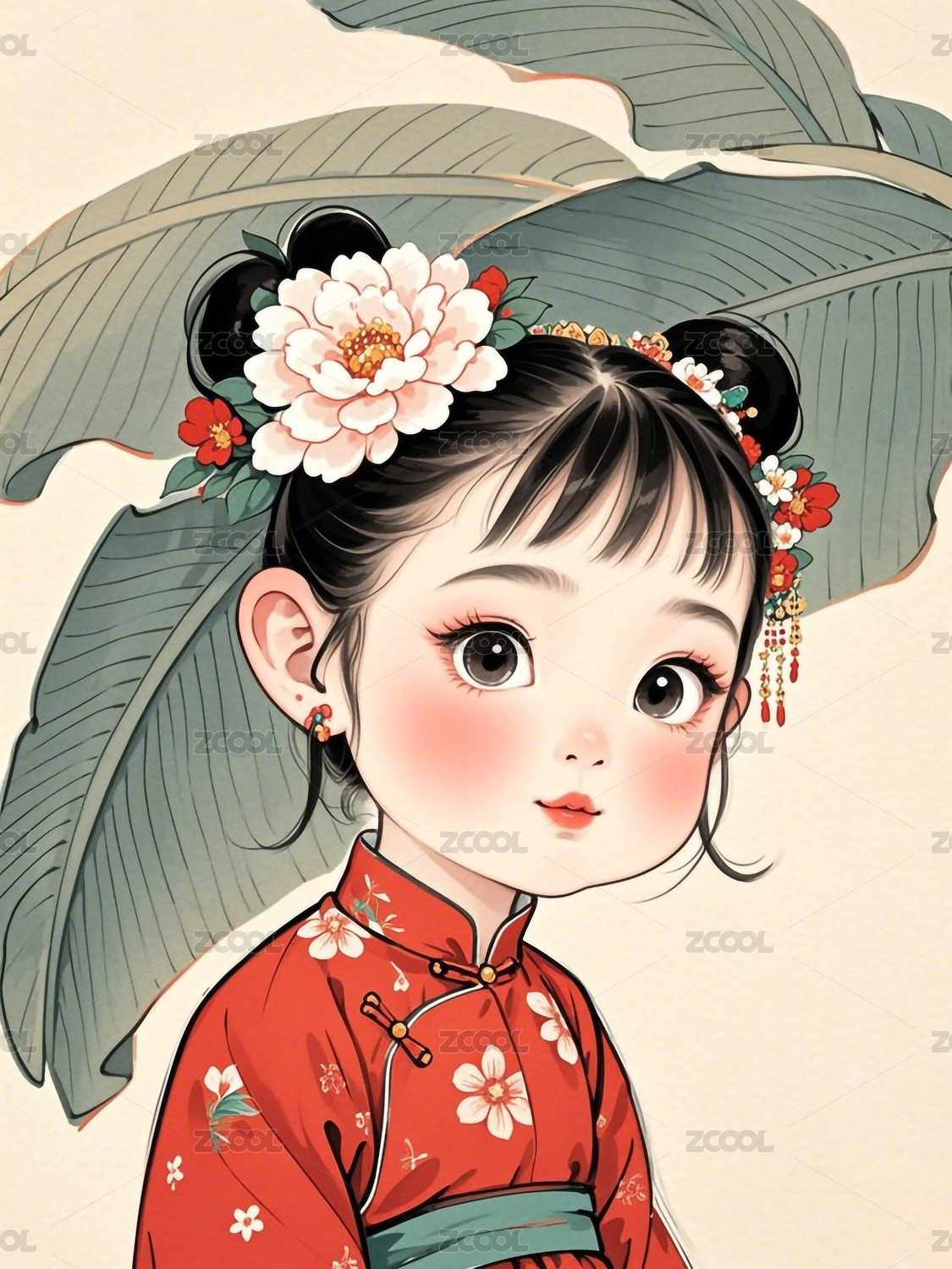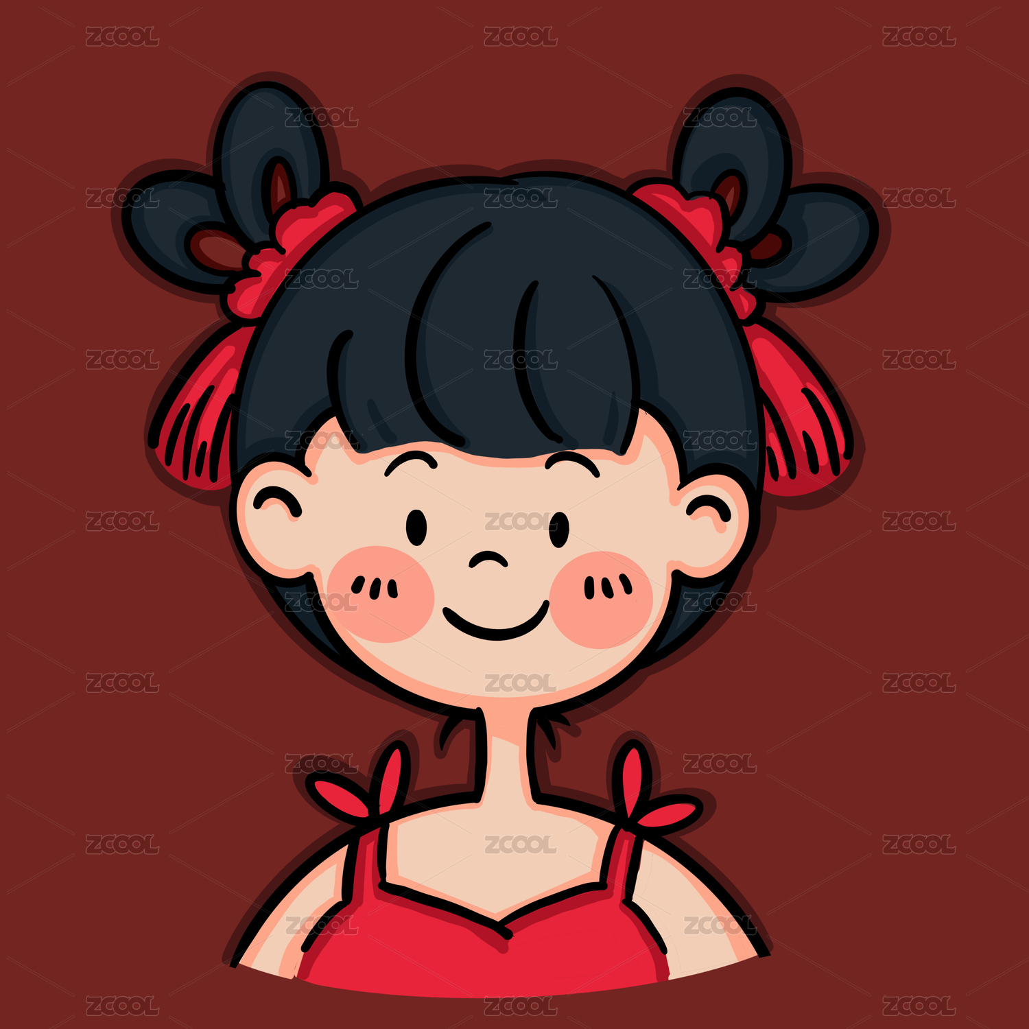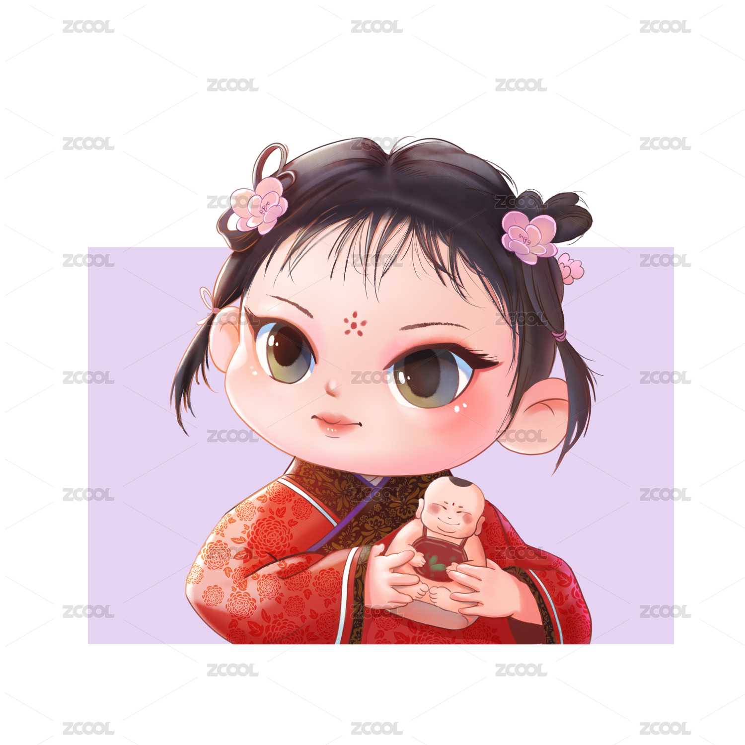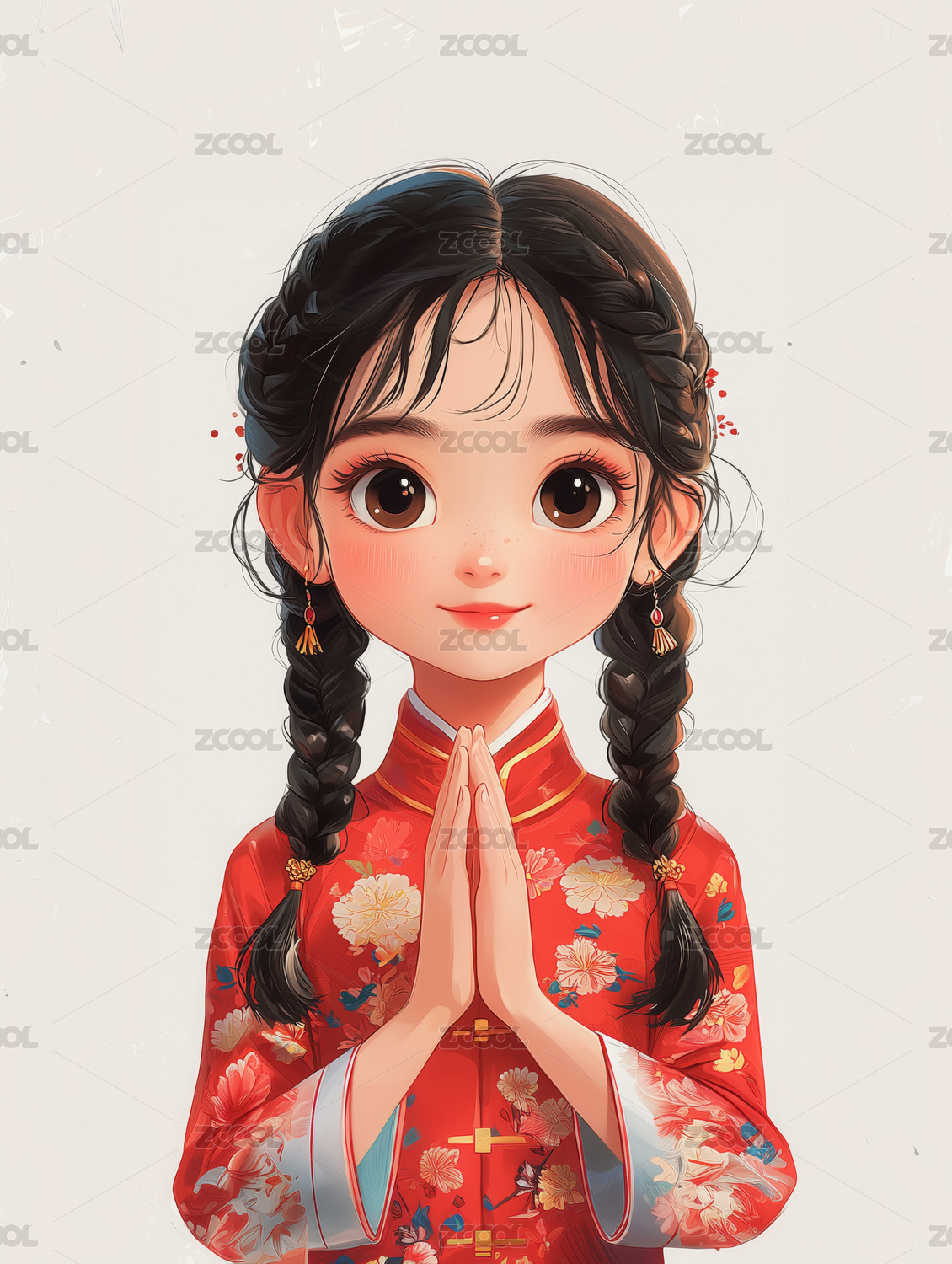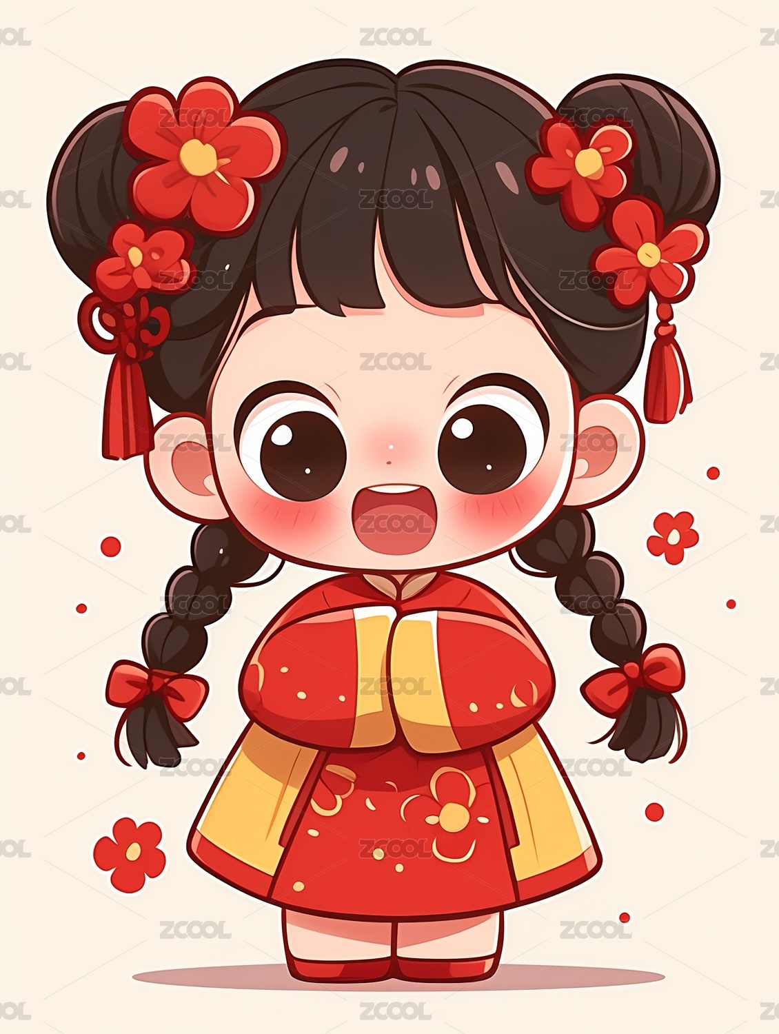 手绘卡通可爱的穿着红色唐装的女孩插画