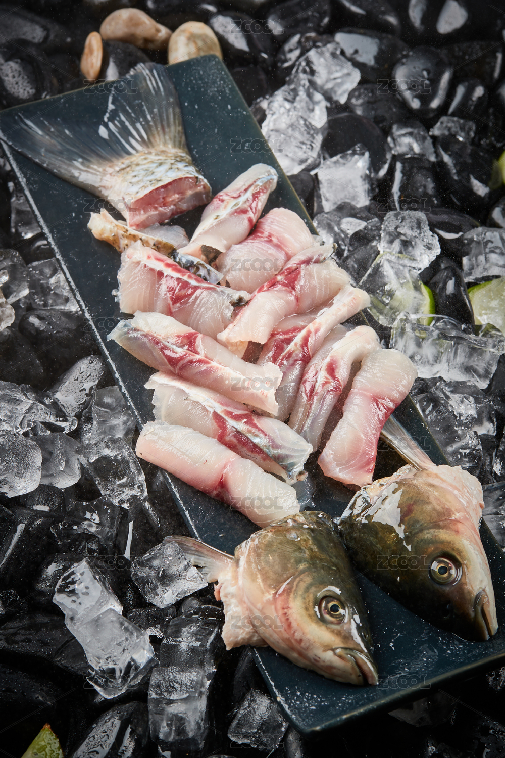 布满碎冰的黑色鹅卵石上摆放的果蔬搭配的鲜鱼头与鱼片