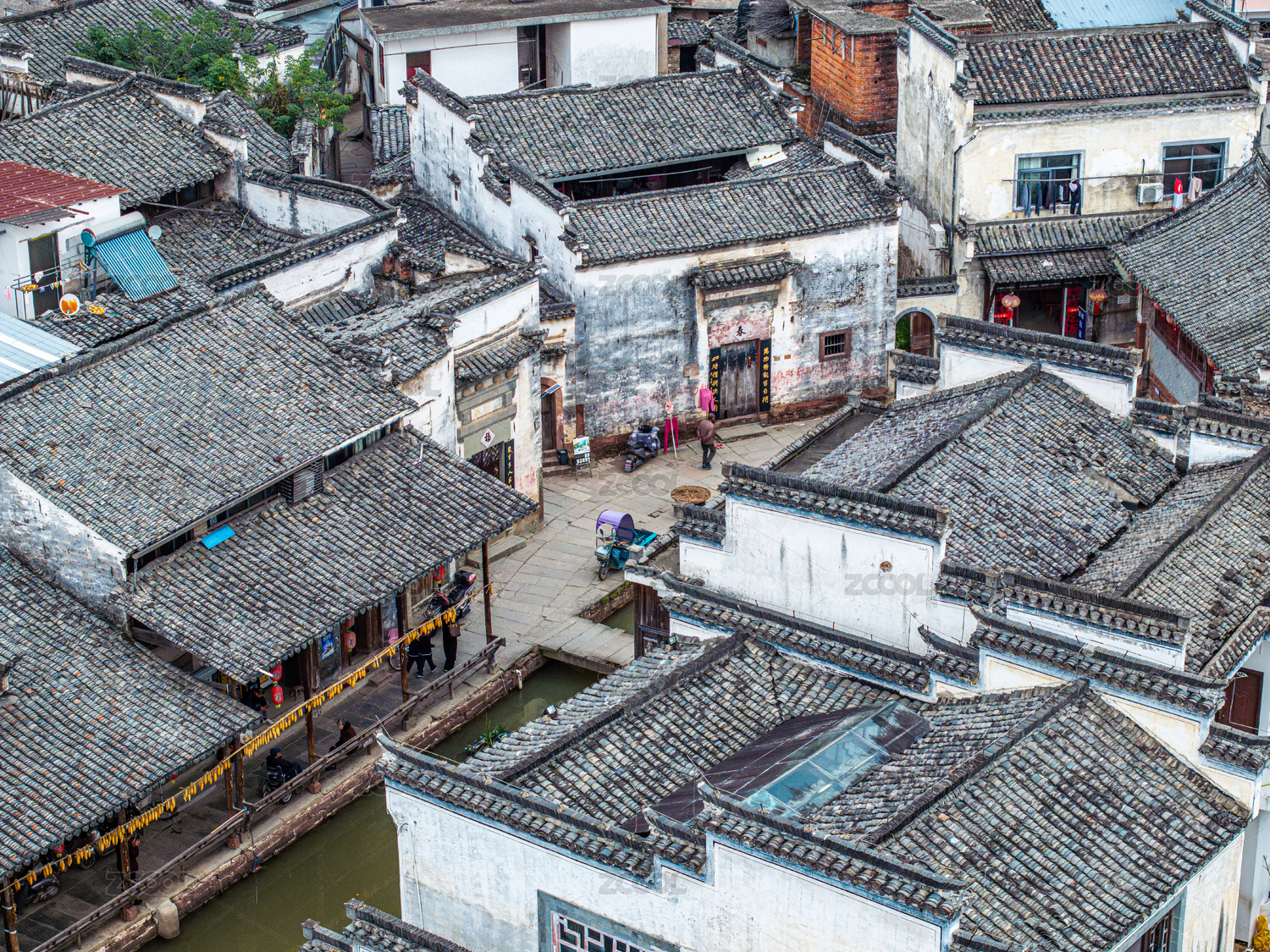 中国浙江濮院古镇街坊民居建筑群屋顶俯拍