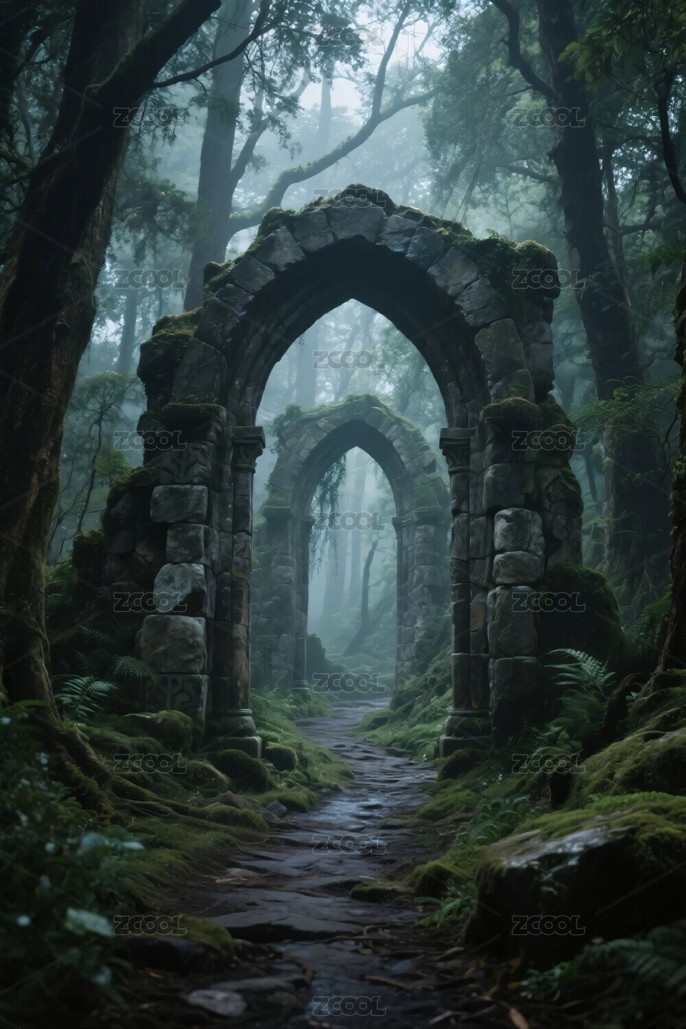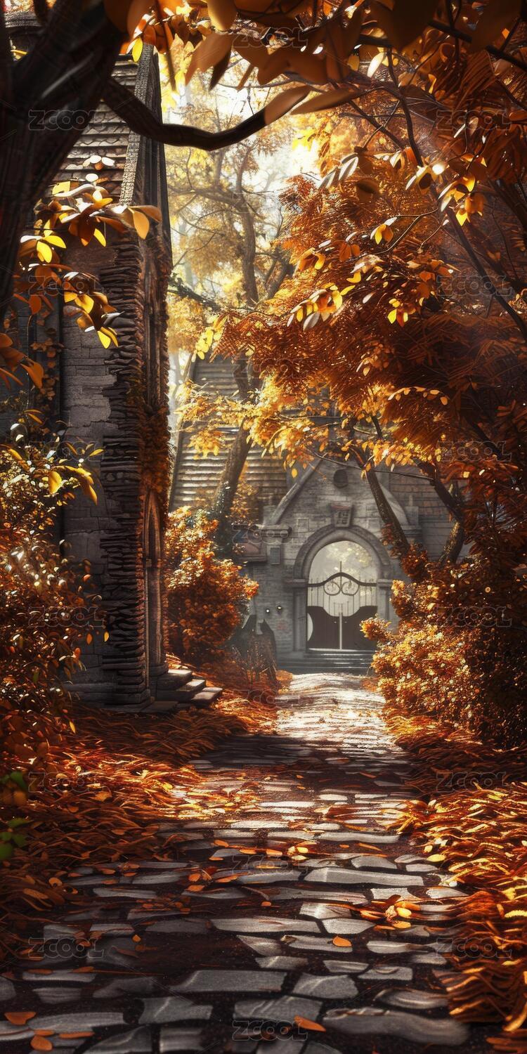 迷雾森林中红枫叶围绕的东方神秘寺庙大门