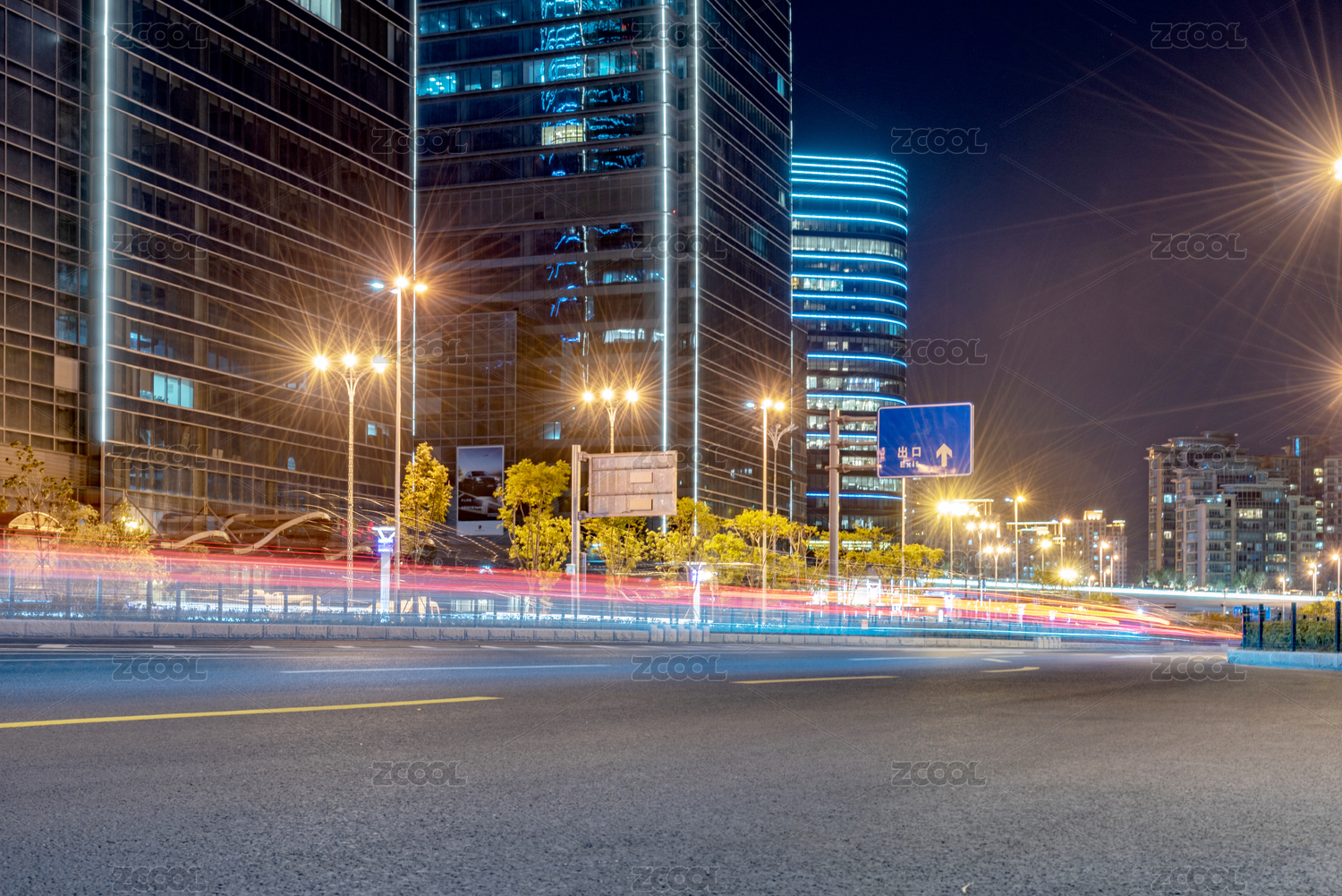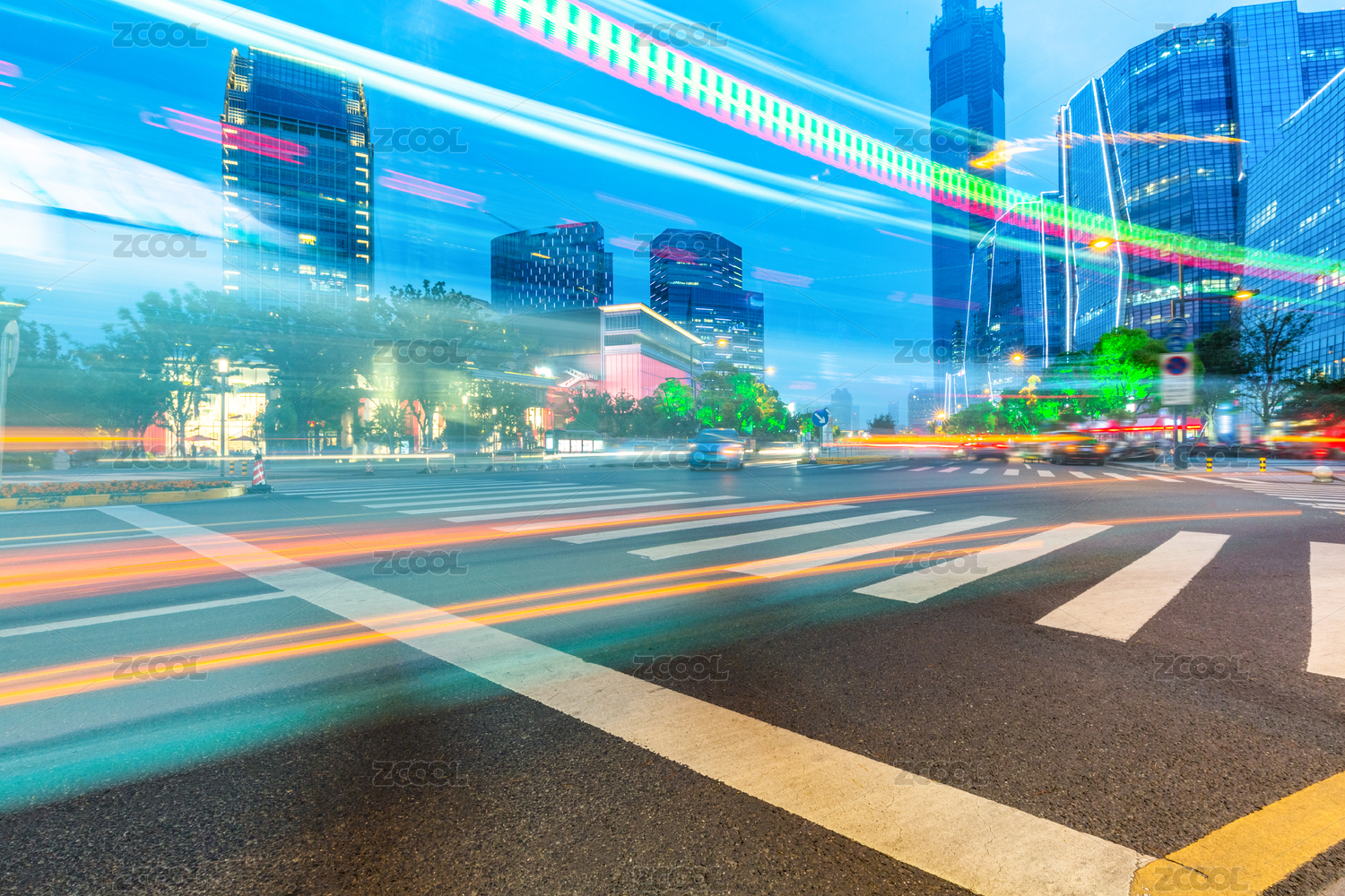 空荡荡的马路,斑马线和摩天大楼夜景