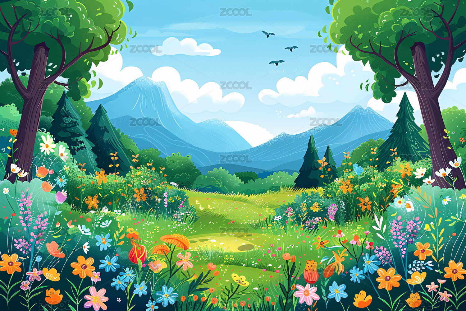 自然,地形,插画,绿色,树,高山,植物,春天,田园风光,旅行