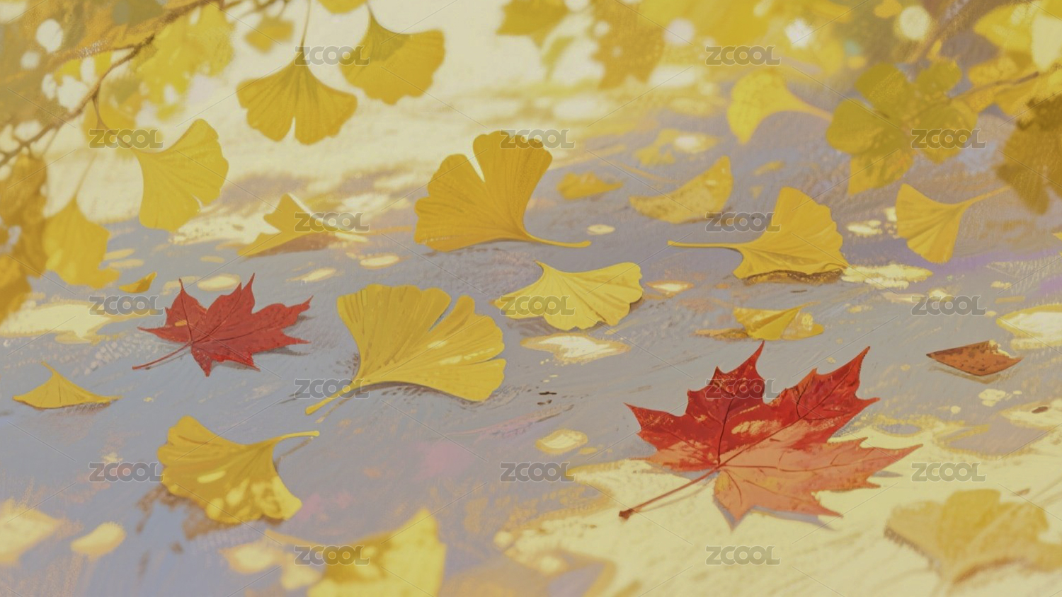AIGC202402,秋季,砖,地面,金黄色,枫叶,手绘,秋天,红叶,叶子