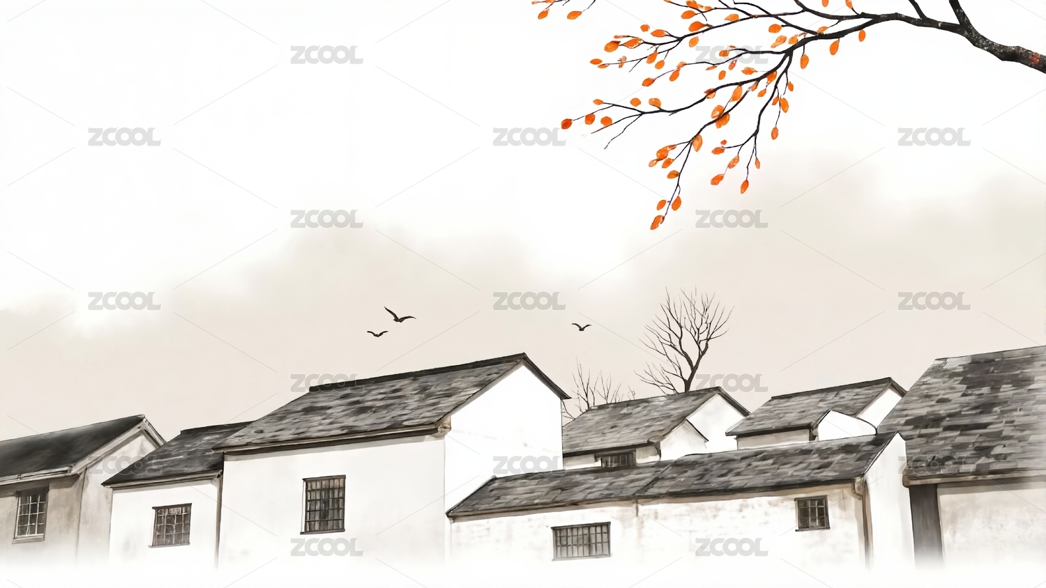 中国风,水墨,水彩,田园,田园生活,母鸡,小鸡,鸡群,瓦房,乡村