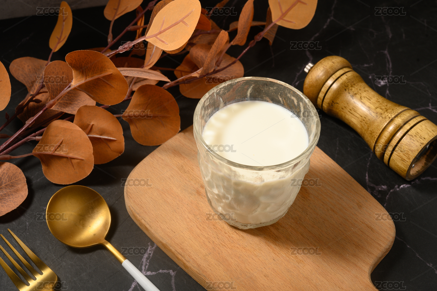 桌面上的杯子里的美味可口的牛奶