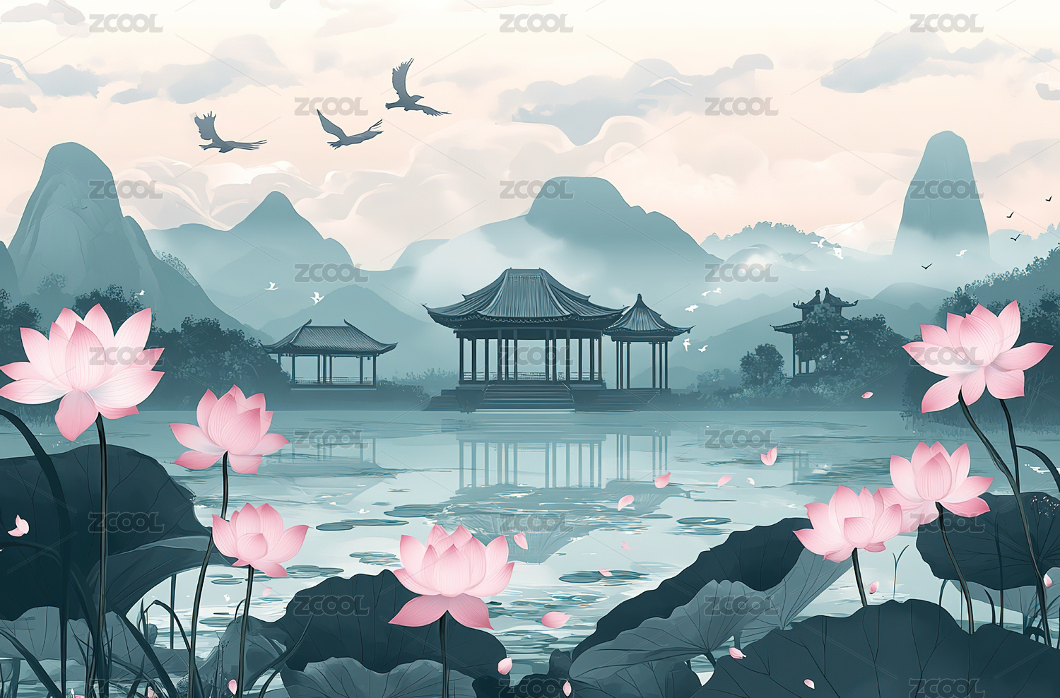 户外,天空,湖,风景,夏天,建筑,云,旅行,荷花