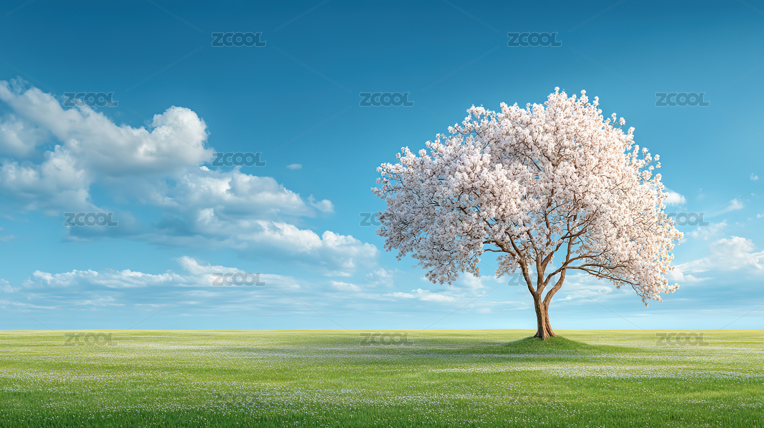 绿色草地上鲜花盛开的一棵树春天风景插画