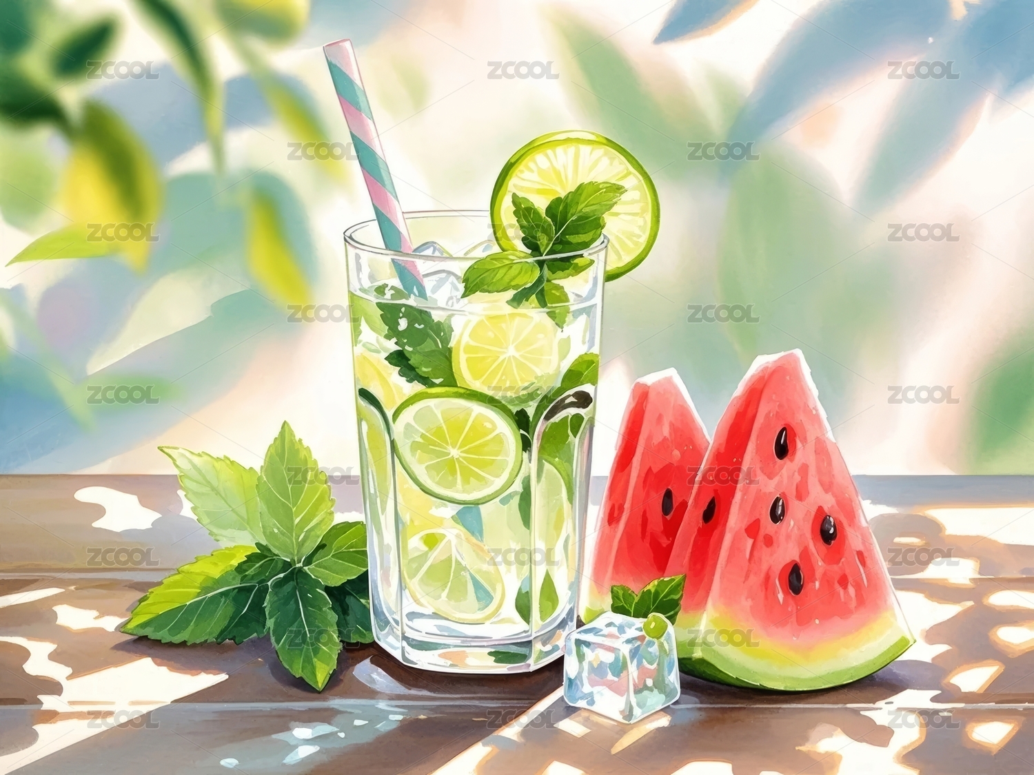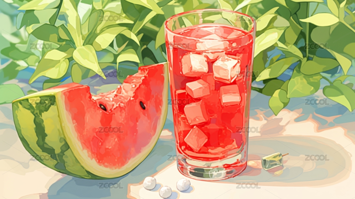 西瓜冰块饮料与绿植背景