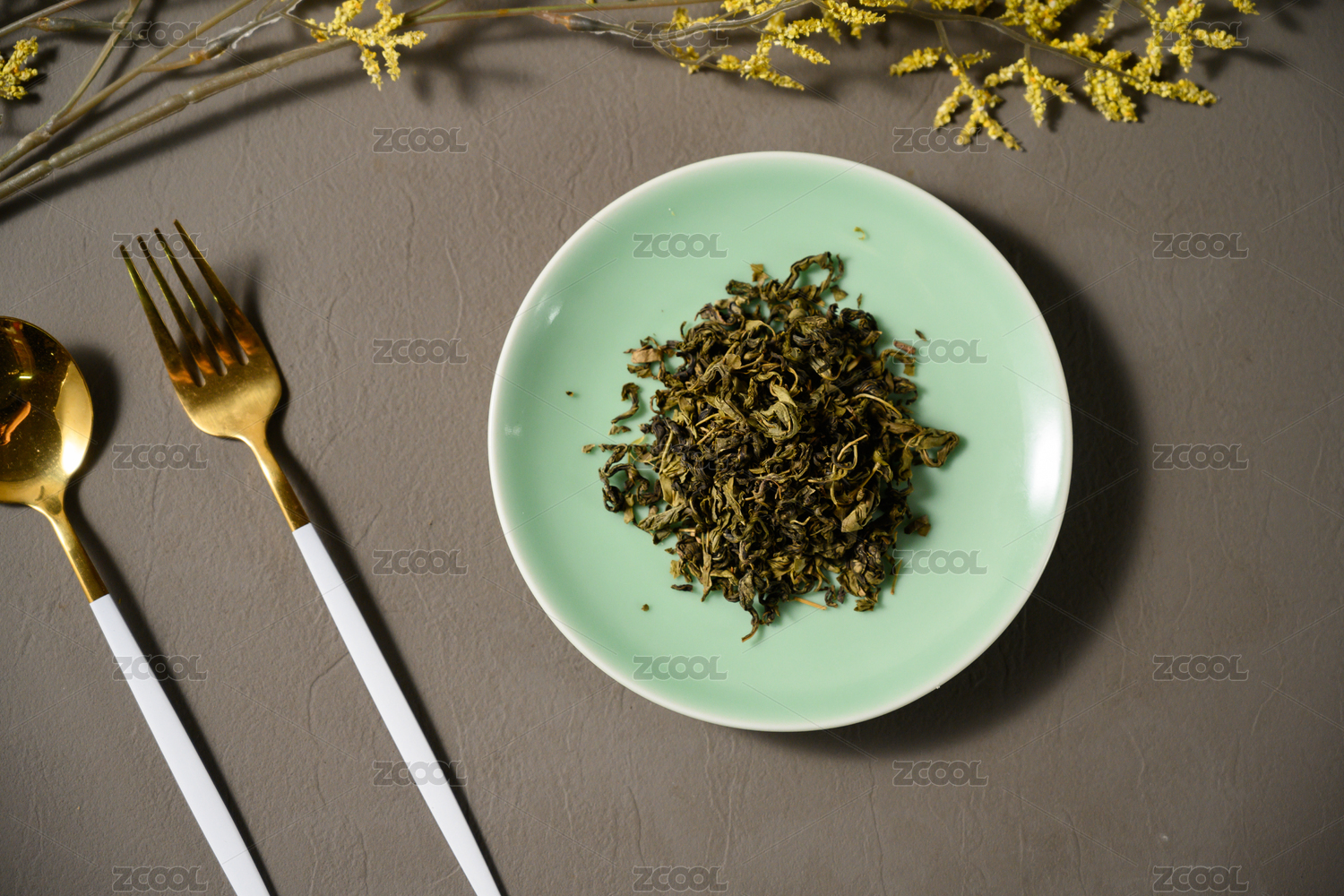 桌面上的盘子里的干爽的丁香茶叶