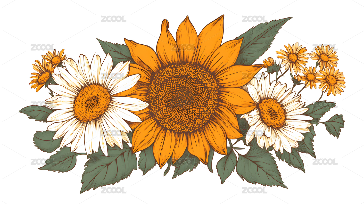向日葵与多种花卉构成的艺术插图