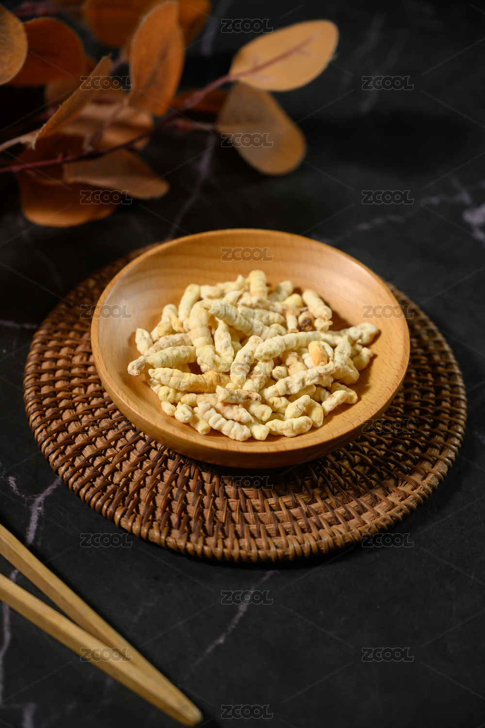 桌面上的盘子里的干爽的地蚕