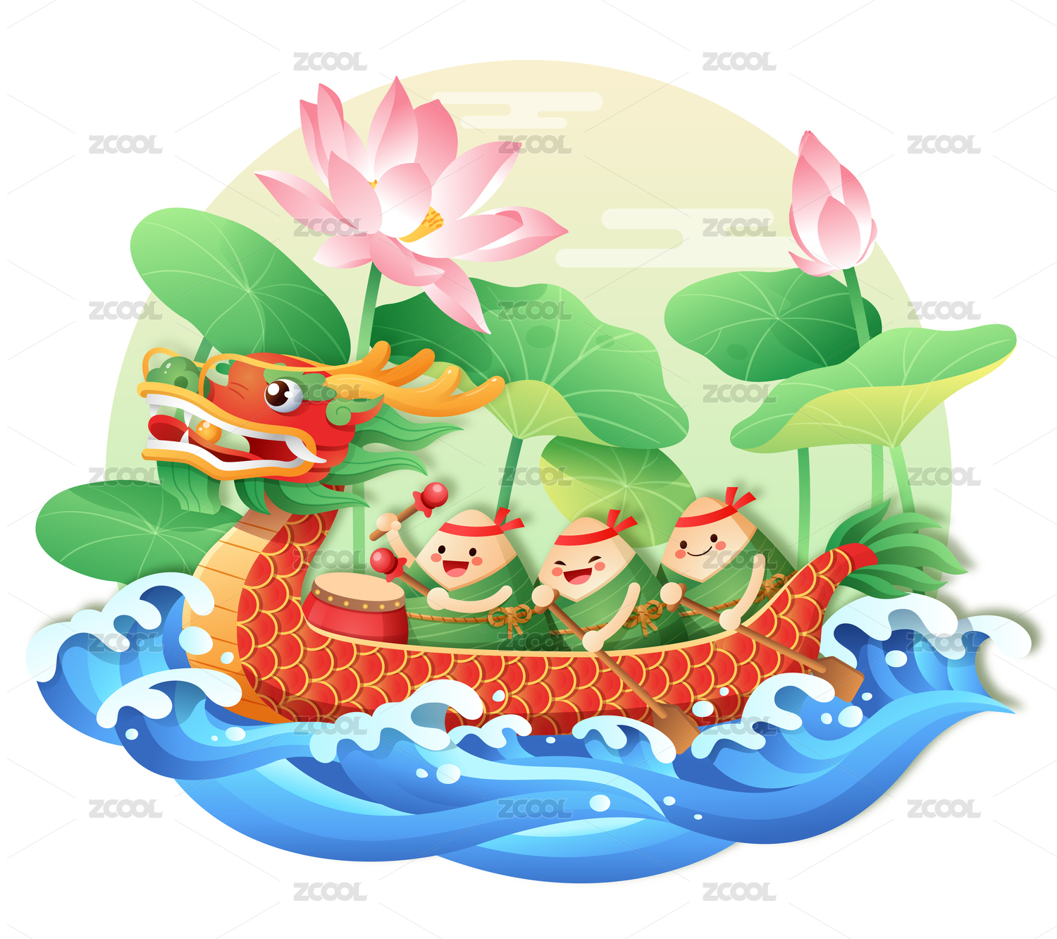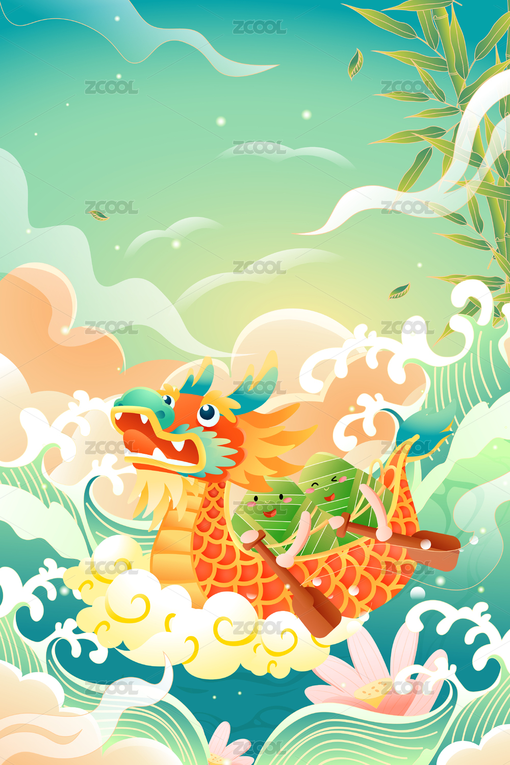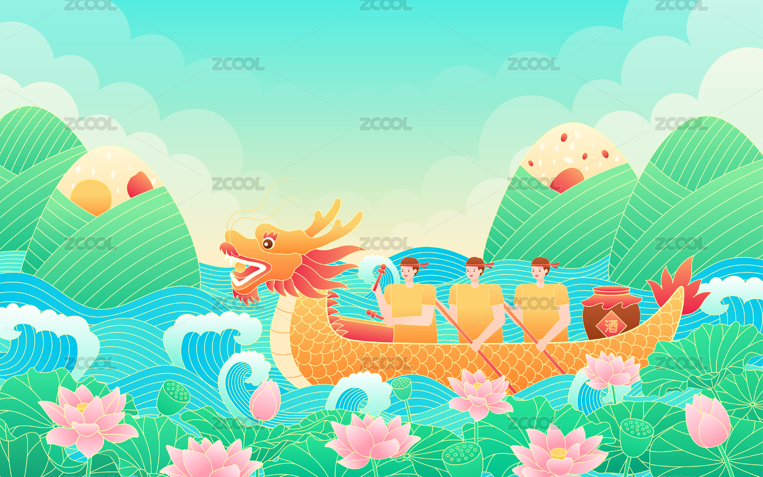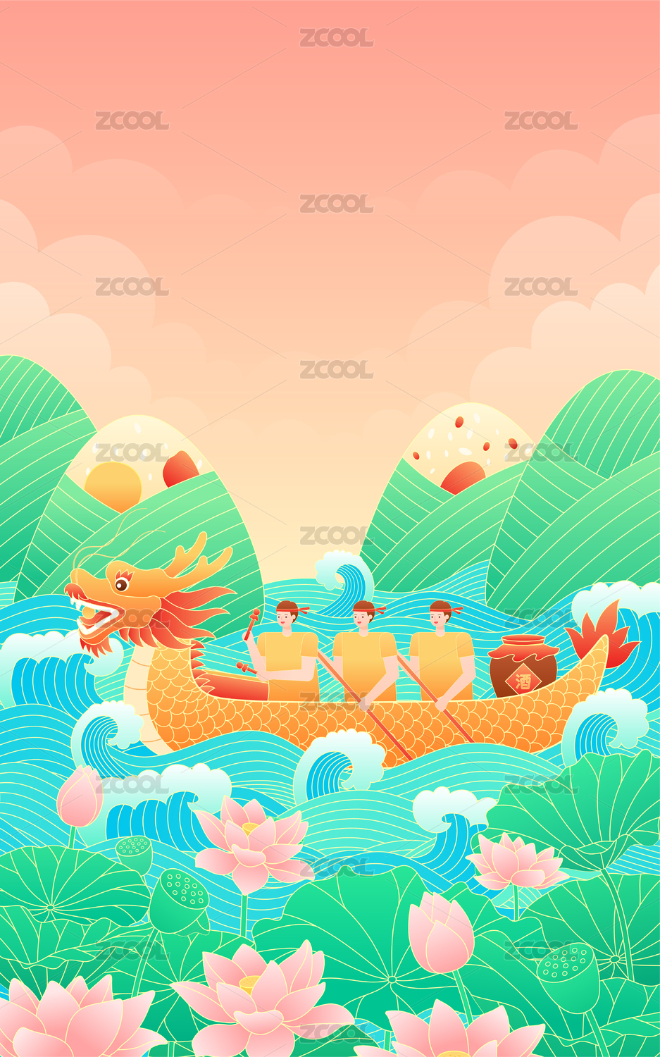 粽子划龙舟和荷花水浪背景