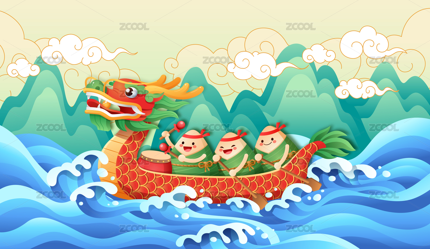 五月初五端午节快乐卡通粽子龙舟国潮插画