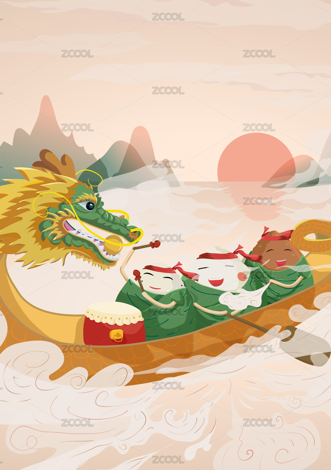 粽子在水上划龙舟中国风插画