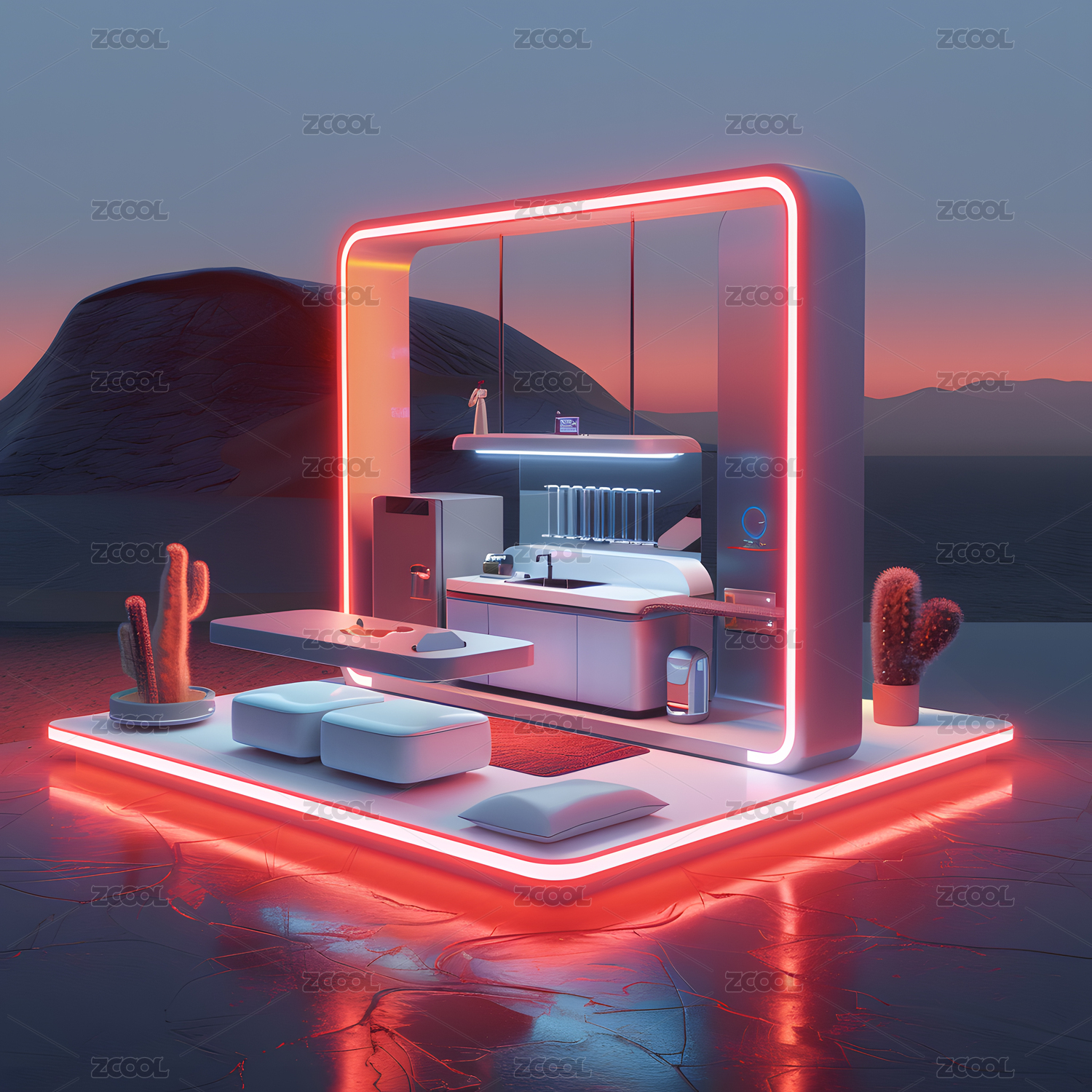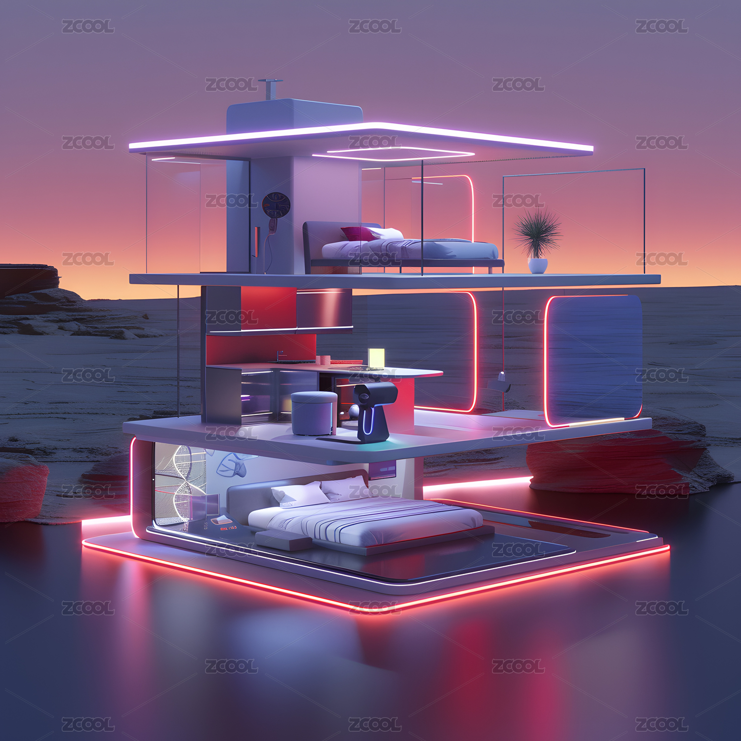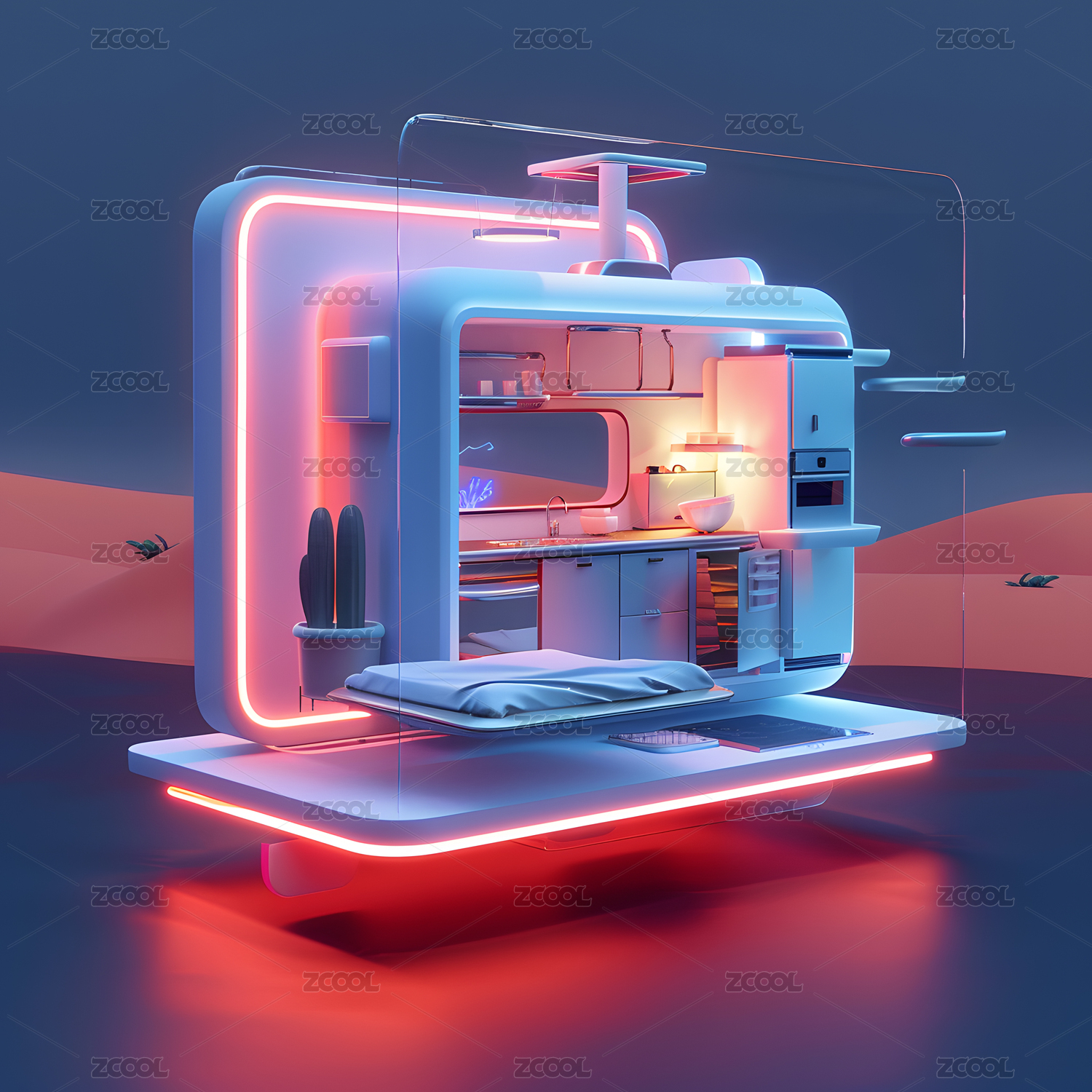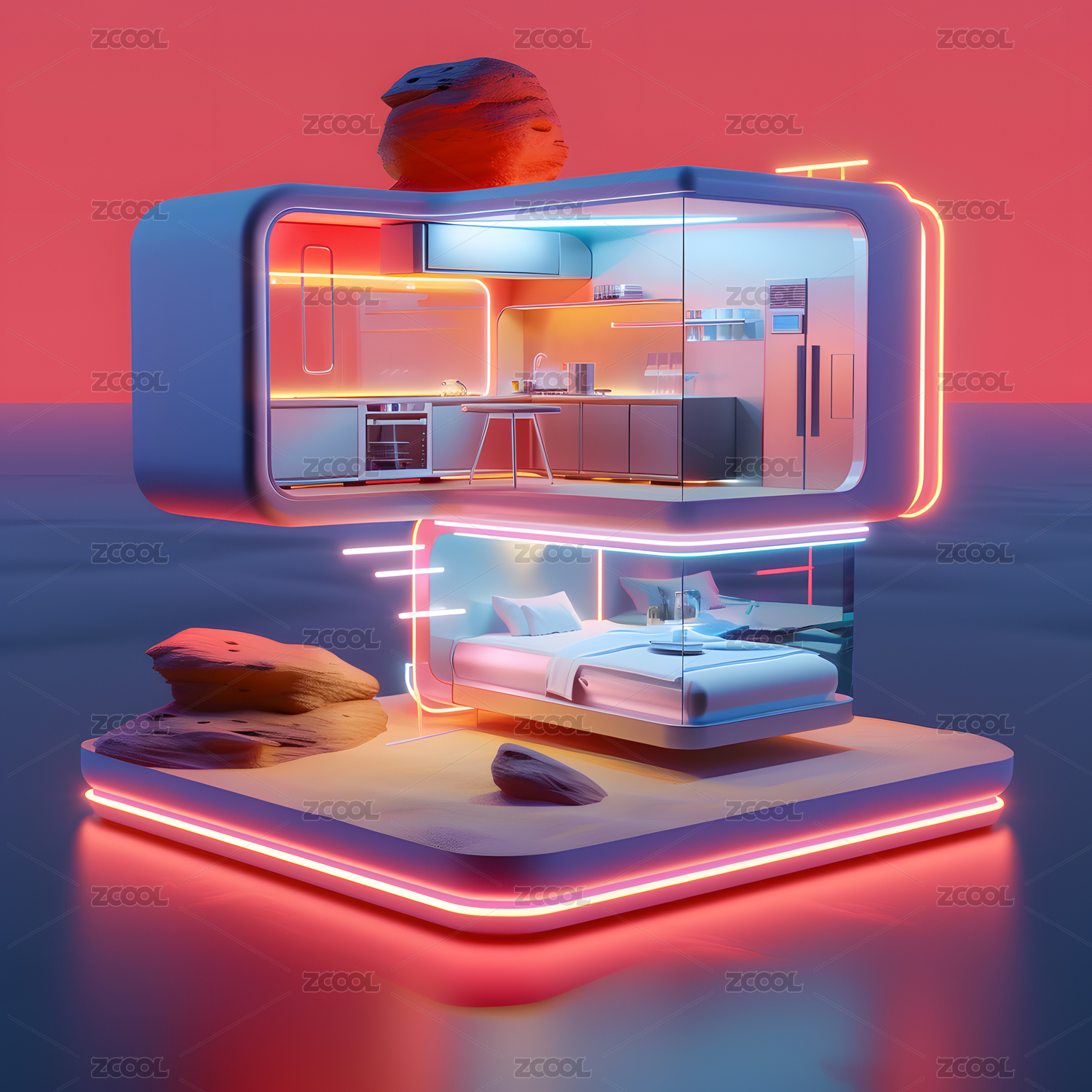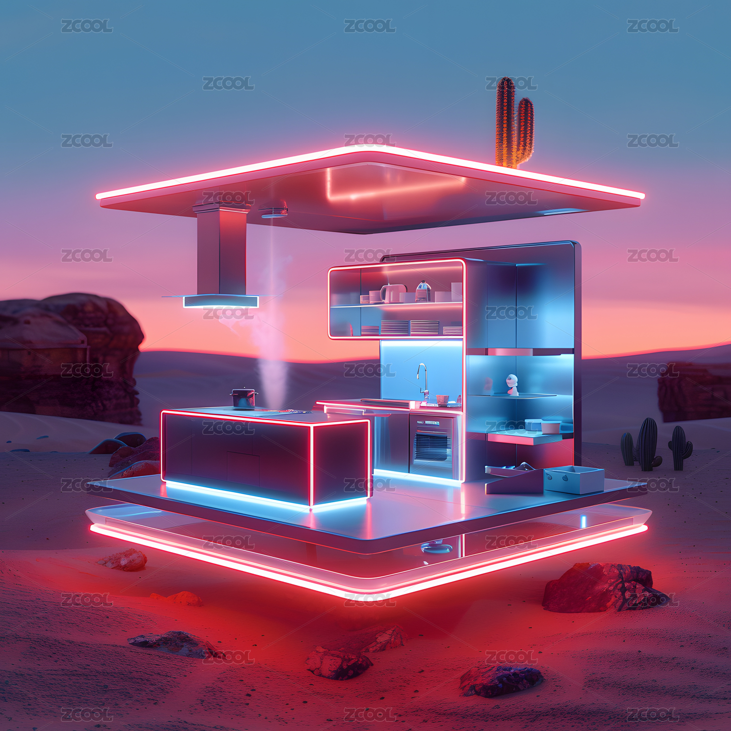 科技感,家居,厨房,3D,立体,场景,未来,科幻,霓虹,建筑